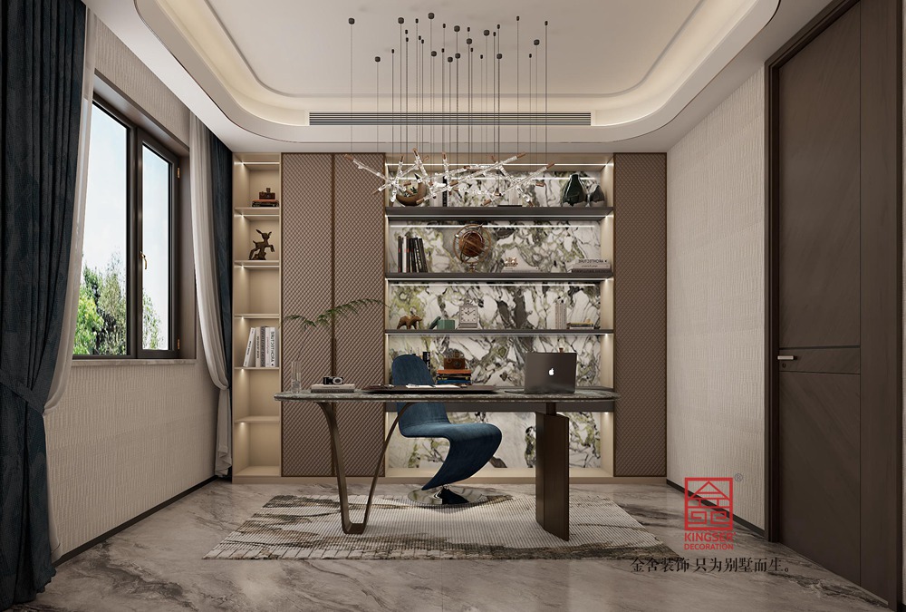 此外,在別墅書房裝修中,還可以加入一些能提升舒適度和美觀度的元素。比如擺放書架,既能增加書籍的收納空間,又能讓書房更有文化氣息;放置一些綠植,不僅可以凈化空氣,還能為書房增添一抹自然色彩,讓人在學習和工作之余,能感受到大自然的生機與活力,緩解疲勞。?