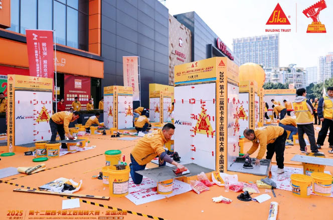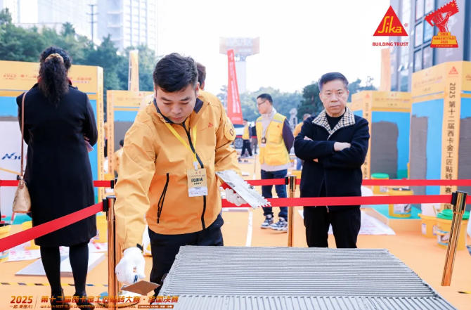 作為家裝行業(yè)的頂級(jí)技能賽事,西卡金工匠大賽以考核嚴(yán)苛著稱,本屆賽事吸引了全國(guó)數(shù)十家頭部企業(yè)的精英選手同臺(tái)競(jìng)技。比賽采用現(xiàn)場(chǎng)實(shí)操的考核模式,裁判組從施工操作、膠漿厚度、表面平整度、縫寬均勻、灰漿飽滿度等幾個(gè)維度進(jìn)行量化評(píng)分,任何一項(xiàng)指標(biāo)偏差都會(huì)讓參賽師傅大幅失分。