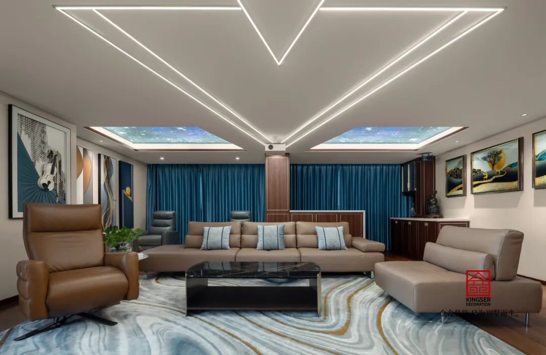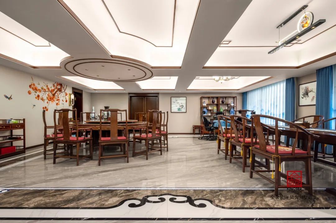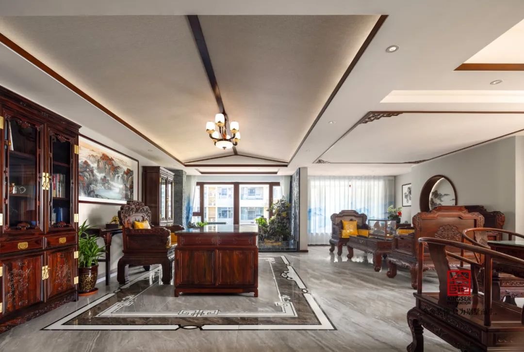 總經(jīng)理辦公室將人工造景與紅木家具完美結(jié)合,休憩,觀景,工作幾方面都不耽誤,空間雅致不凡,頂面不同造型的吊頂也是將使用功能不同的空間完美分開,塑造出一種非同尋常的貴氣效果。