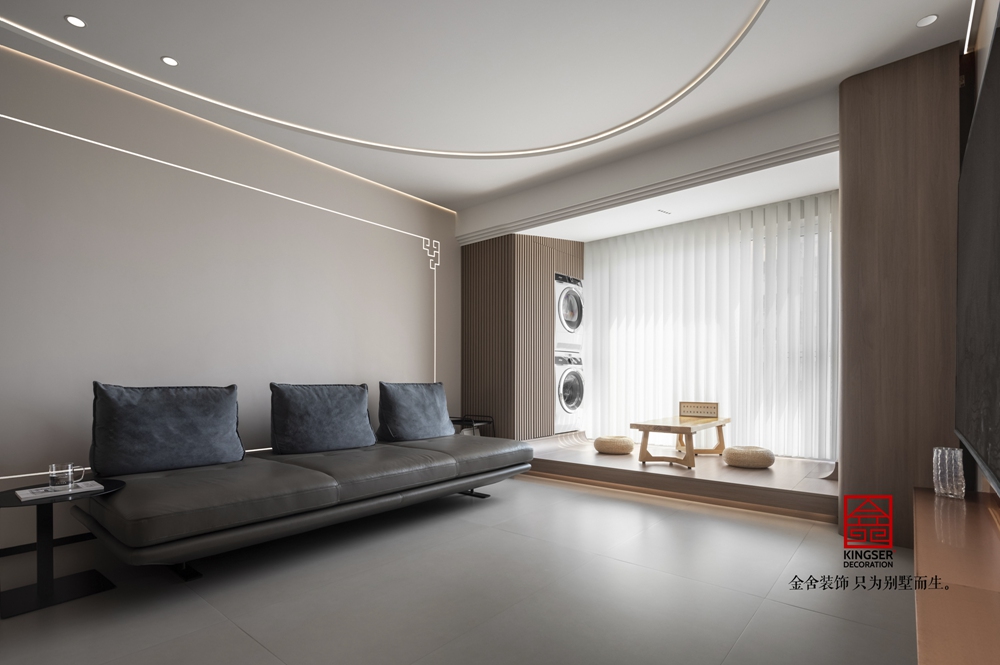 客廳空間沒有安置茶幾,這種無茶幾的設計 ,讓整個空間看起來更加的寬敞,本身就是一家五口,這樣的設置,也給了孩子足夠的運動空間,沙發(fā)背景墻用燈條拼接而成,中式紋理的也被制作了進去,讓整個空間充滿文化的氣息。