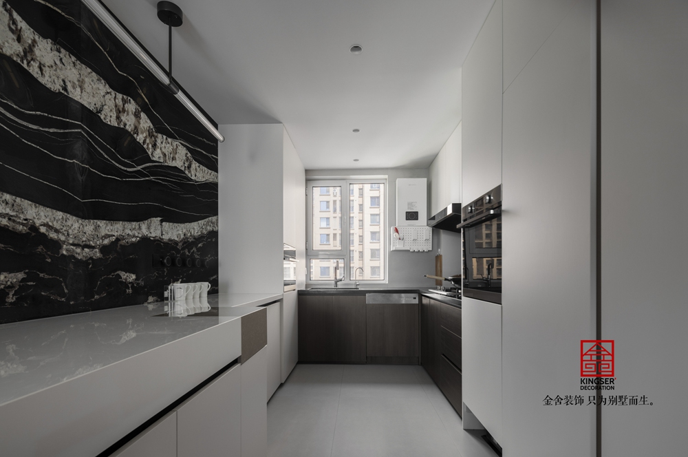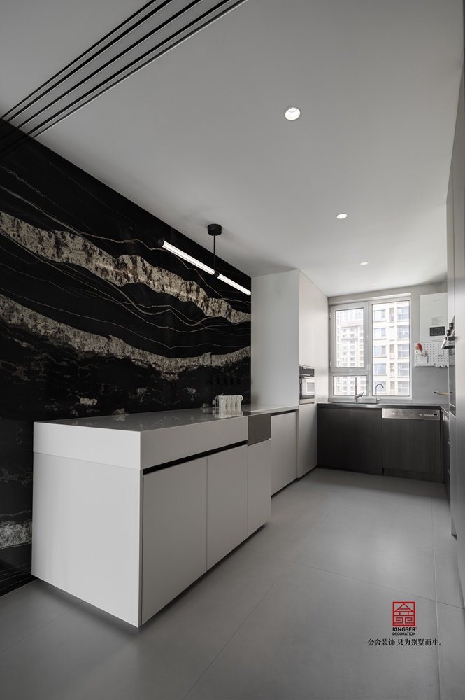 乍一看起來是一個開敞的廚房,其實還做了一個隱形門,既保證了采光,也讓整個空間更加的舒適整潔,黑與白相間的背景石材如同江河奔涌,充滿了未知與希望。