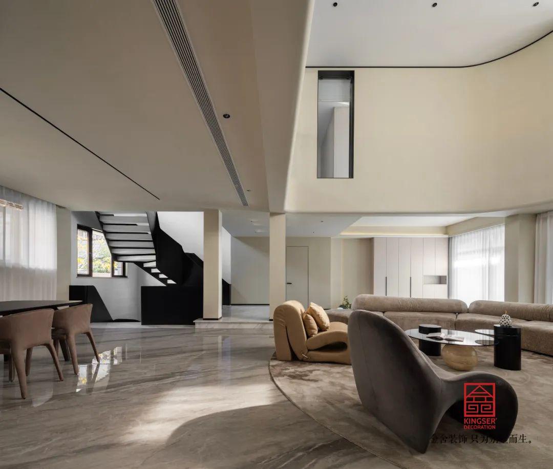 巨大的挑空空間之下,是設(shè)計(jì)師對(duì)于設(shè)計(jì)的把控,首層6米挑空客廳以鋼化玻璃幕墻打造通透感,雙層中空玻璃引入充沛自然光,半開放的廚房、島臺(tái)吧臺(tái)與落地窗景融為一體。全屋采用暖白、卡其、米咖等低飽和色調(diào),墻面啞光質(zhì)感涂料與淺咖沙發(fā)碰撞,塑造出極具質(zhì)感的空間。