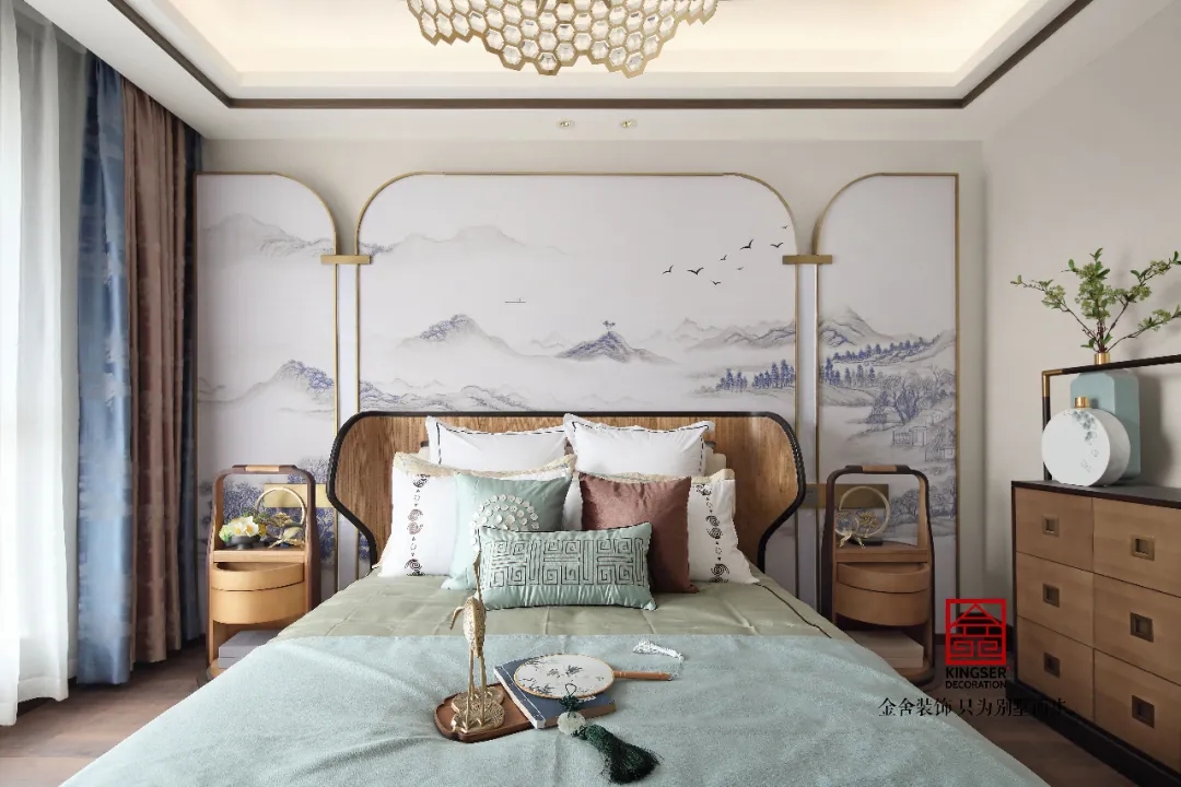 溫馨雅致的風格,主臥以水墨油畫床背幅搭配淡綠色床品,于沉穩(wěn)中煥發(fā)和諧自然的氣氛;