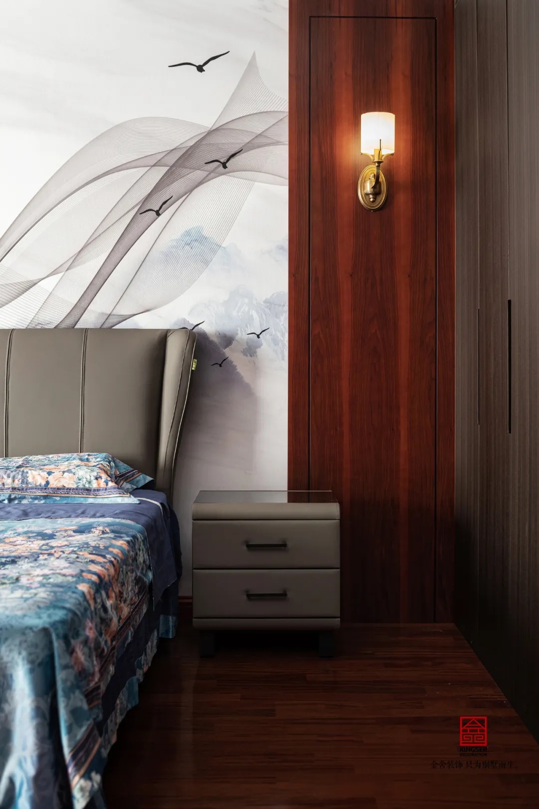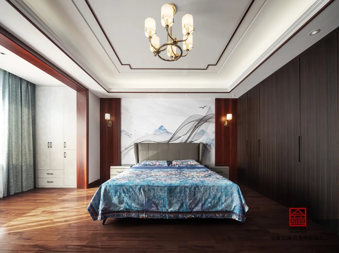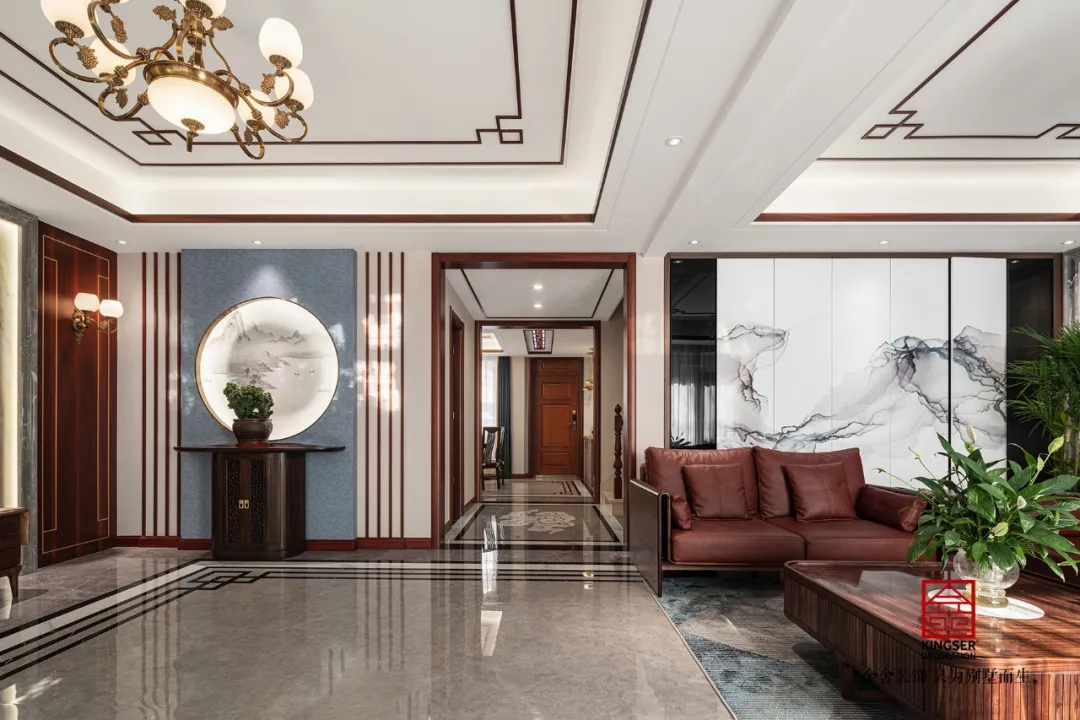 此案例為金舍裝飾-大者別墅300平米新中式風(fēng)格裝修實(shí)景。繽紛的世界,滿眼的山色。時(shí)常仰慕古人,可以把顏色分得如此細(xì)膩,連名字也起得那般富有詩(shī)意:翠為山色,碧為湖色,丹是云霞升騰。顏色,是渾然天成的畫,是生活經(jīng)驗(yàn)?zāi)Y(jié)成的詩(shī),人們一見名字,便心領(lǐng)神會(huì),在腦里生出了意境。