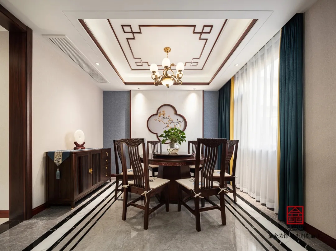 梅花窗的設(shè)計(jì)在這個(gè)空間中獨(dú)具風(fēng)味,歲寒三友,物如其名,高潔的品質(zhì)中突出的那份傲骨,天圓地方的餐桌吊頂設(shè)計(jì)也是符合了古代中國(guó)陰陽(yáng)哲學(xué)思想。天道曰圓,地道曰方,天人合一,方懂世間短長(zhǎng)。