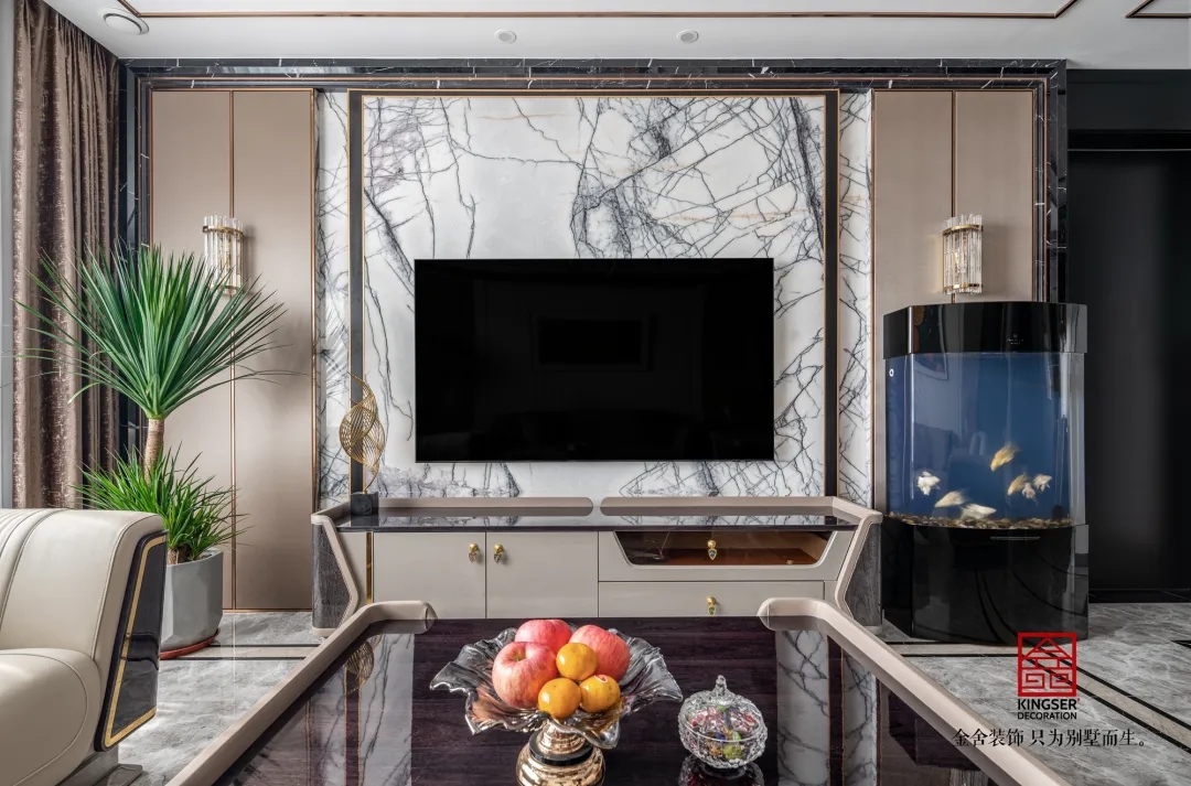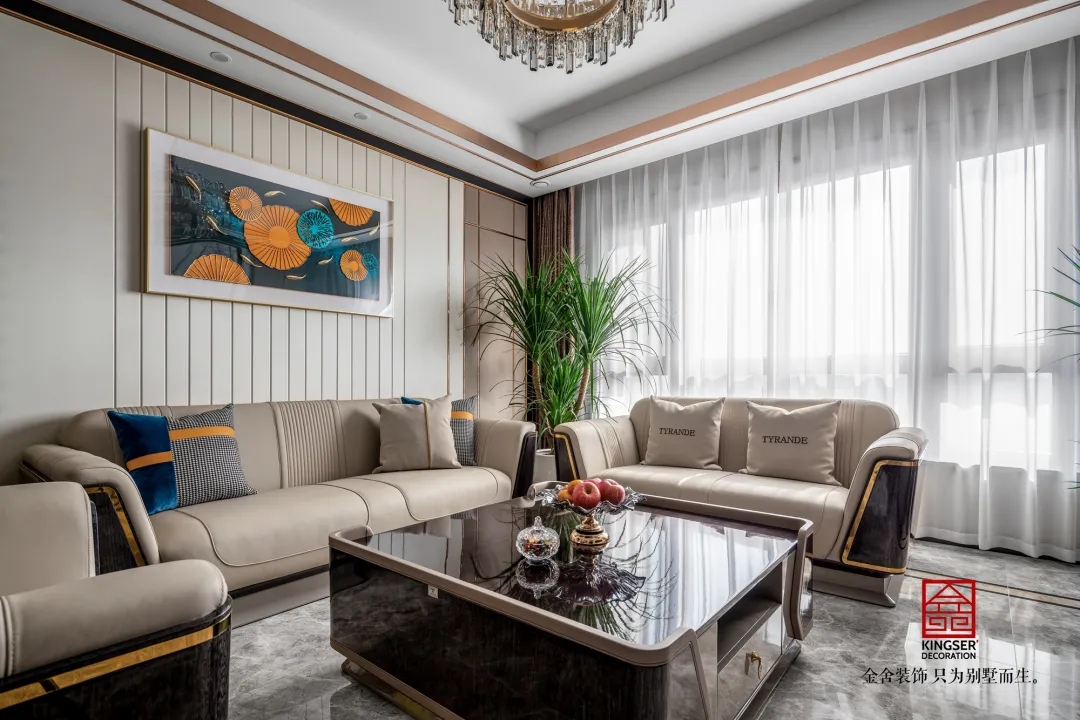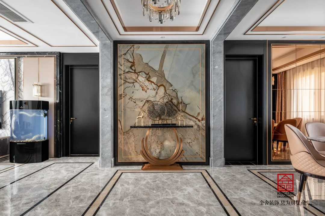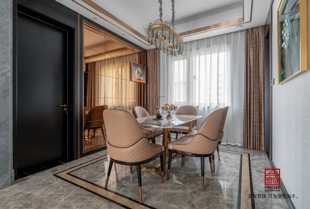 此案例為金舍裝飾- 國赫天著155平米港式風(fēng)格裝修實(shí)景。港式輕奢結(jié)合硬裝奢華的界面,軟裝通過金屬、皮革、亮面質(zhì)感的家飾強(qiáng)化奢華、優(yōu)雅的主題,由米色、咖色為主,搭配經(jīng)典的黑白灰,注入些許亮色,點(diǎn)綴金色、奢華而不失時(shí)尚。