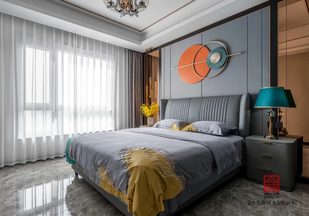 客廳整體以灰色為基調(diào),采用硬包做背景,用金屬飾品加以點(diǎn)綴,加上直線型的吊頂,凸顯出輕奢的質(zhì)感。