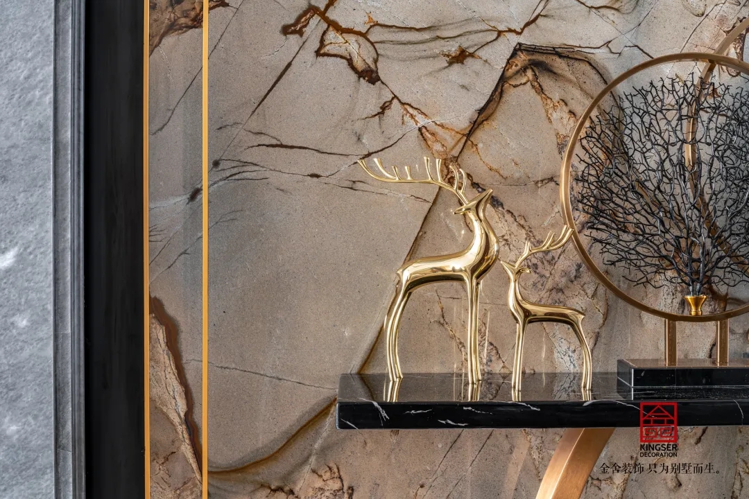 玄關(guān)入戶處采用金屬質(zhì)地的玄關(guān)臺,與頂面和墻面等多空間的金屬色彩交相呼應(yīng),達(dá)到一種融合統(tǒng)一的感覺。同時(shí)玄關(guān)處的大理石背景墻的運(yùn)用也與電視墻有著異曲同工之妙。象征吉順的鹿造型擺件。