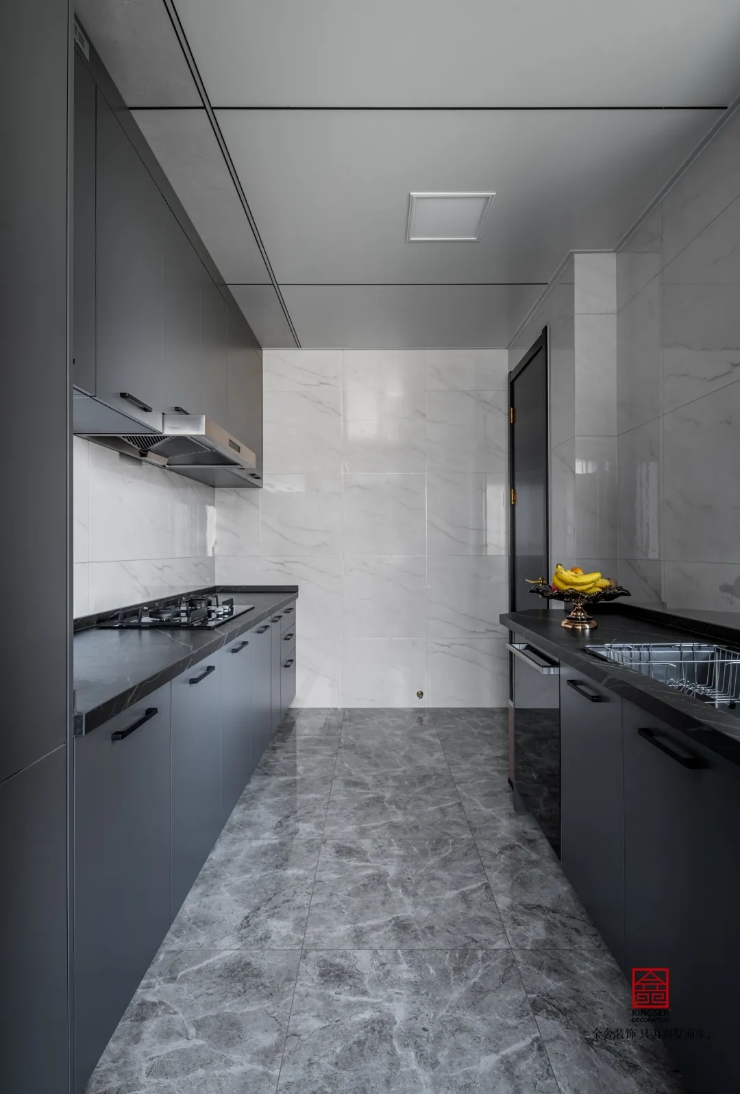 山巒溝壑一般的線條,顯現(xiàn)在光滑的大理石上,給整個(gè)空間注入一分嚴(yán)肅與格調(diào)。簡潔明快的風(fēng)格,兼具了時(shí)尚和潮流,用開放式設(shè)計(jì)手法去詮釋空間氛圍,使整個(gè)空間舒適而明亮。