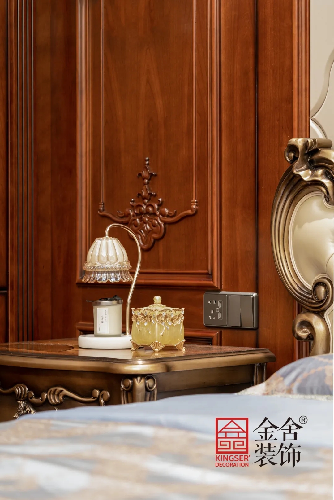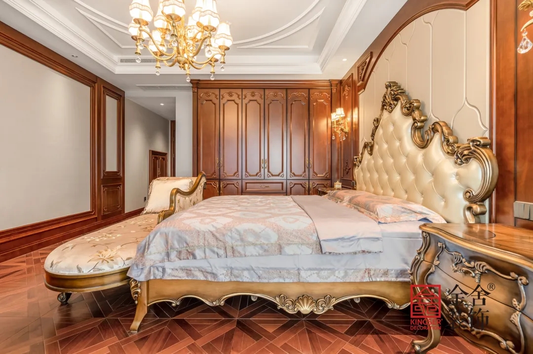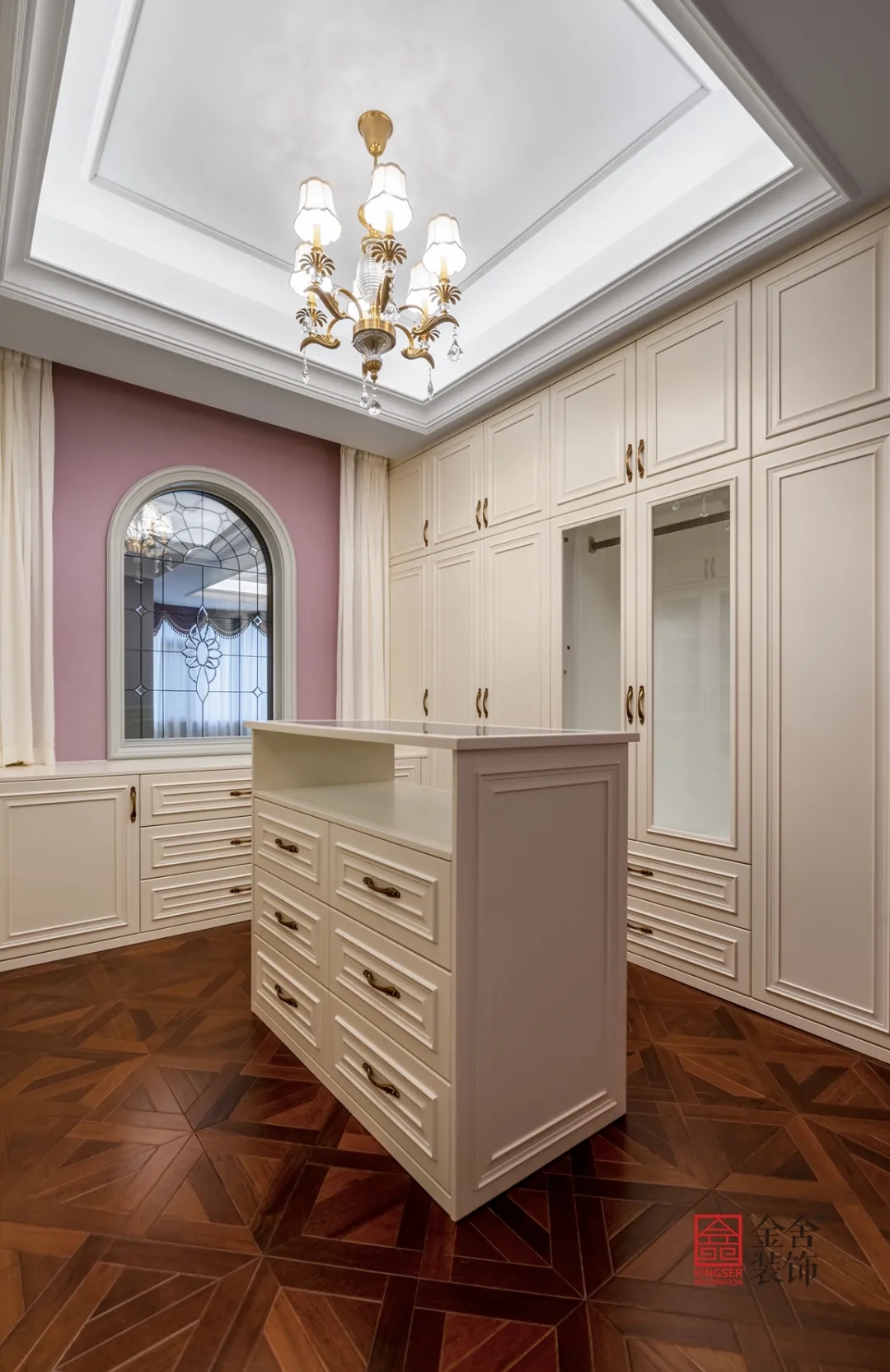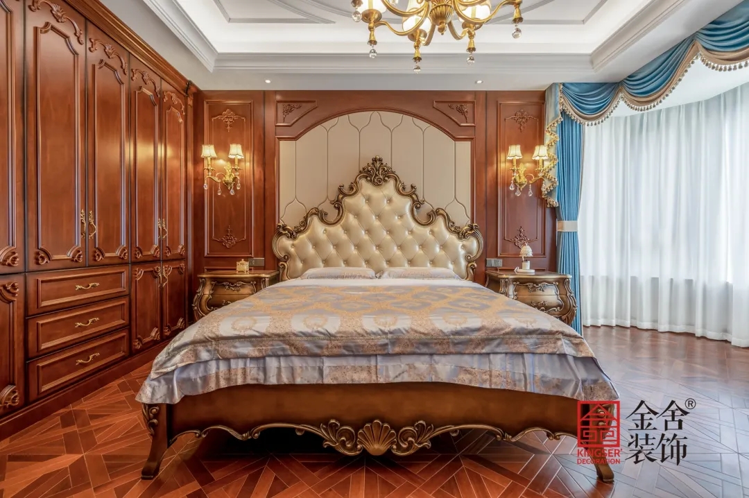 主臥是個套間。衣帽間,書房,主臥三位一體。色彩呈現(xiàn)依舊用寶藍(lán)色的窗簾與棕褐色的家具形成對比,歐式傳統(tǒng)的金屬吊燈則起到畫龍點(diǎn)睛的作用,置身其中,舒適、溫馨的感覺襲人,讓心靈找到了歸宿。