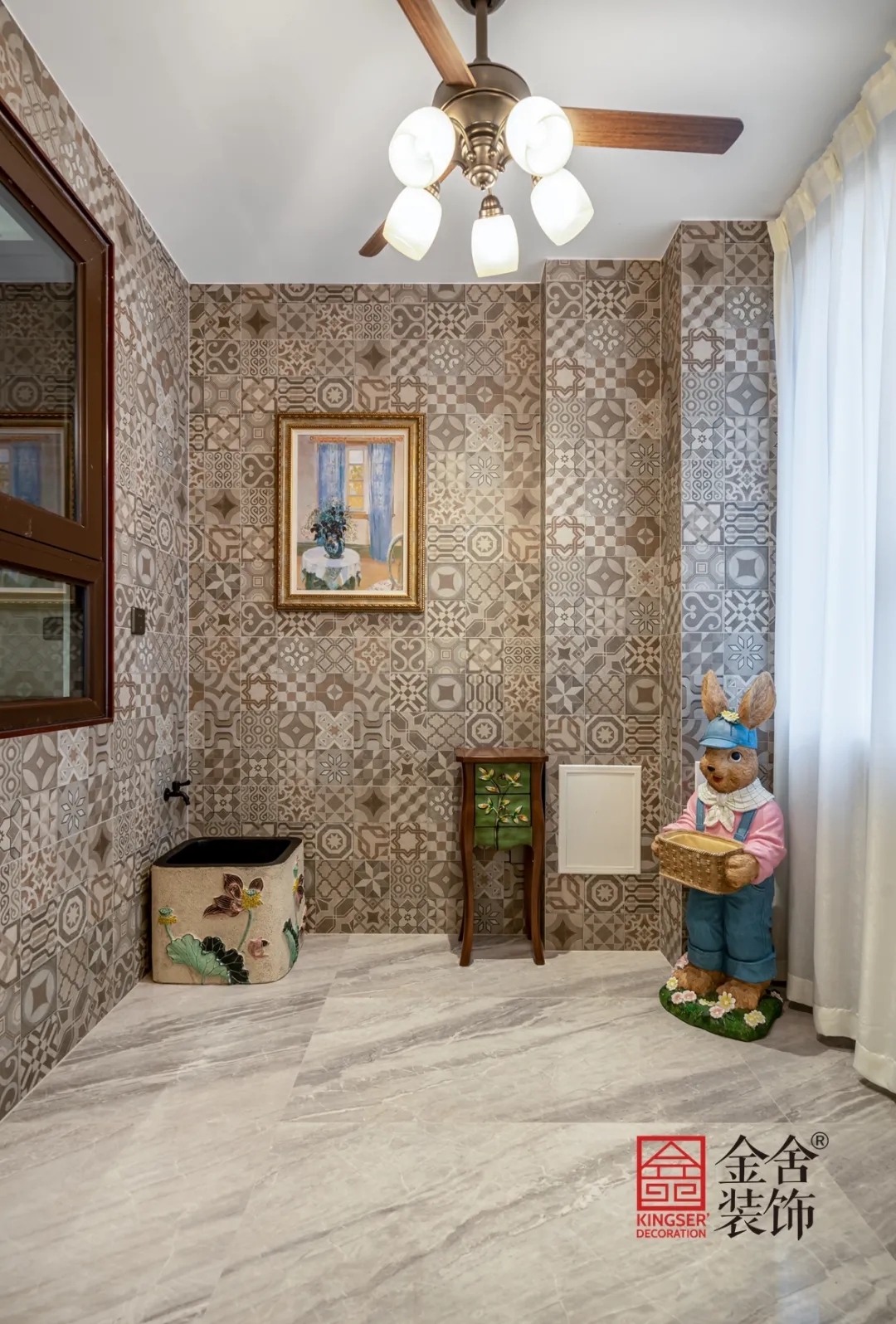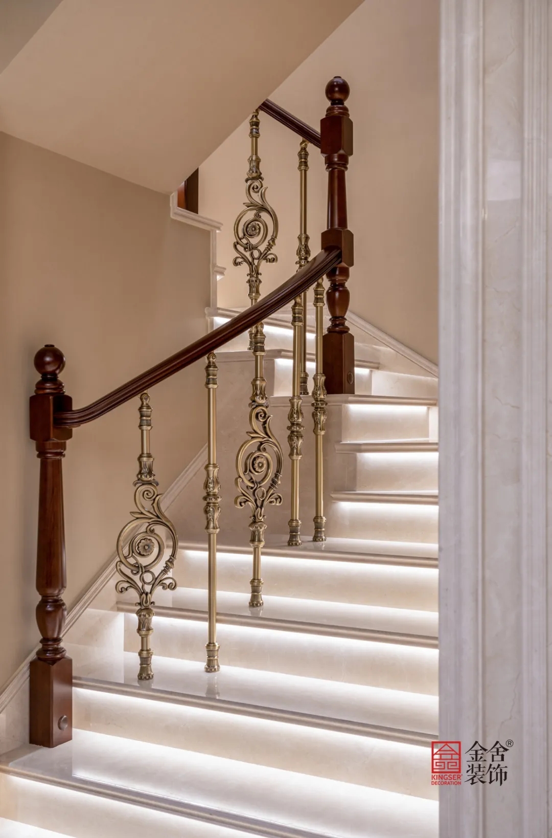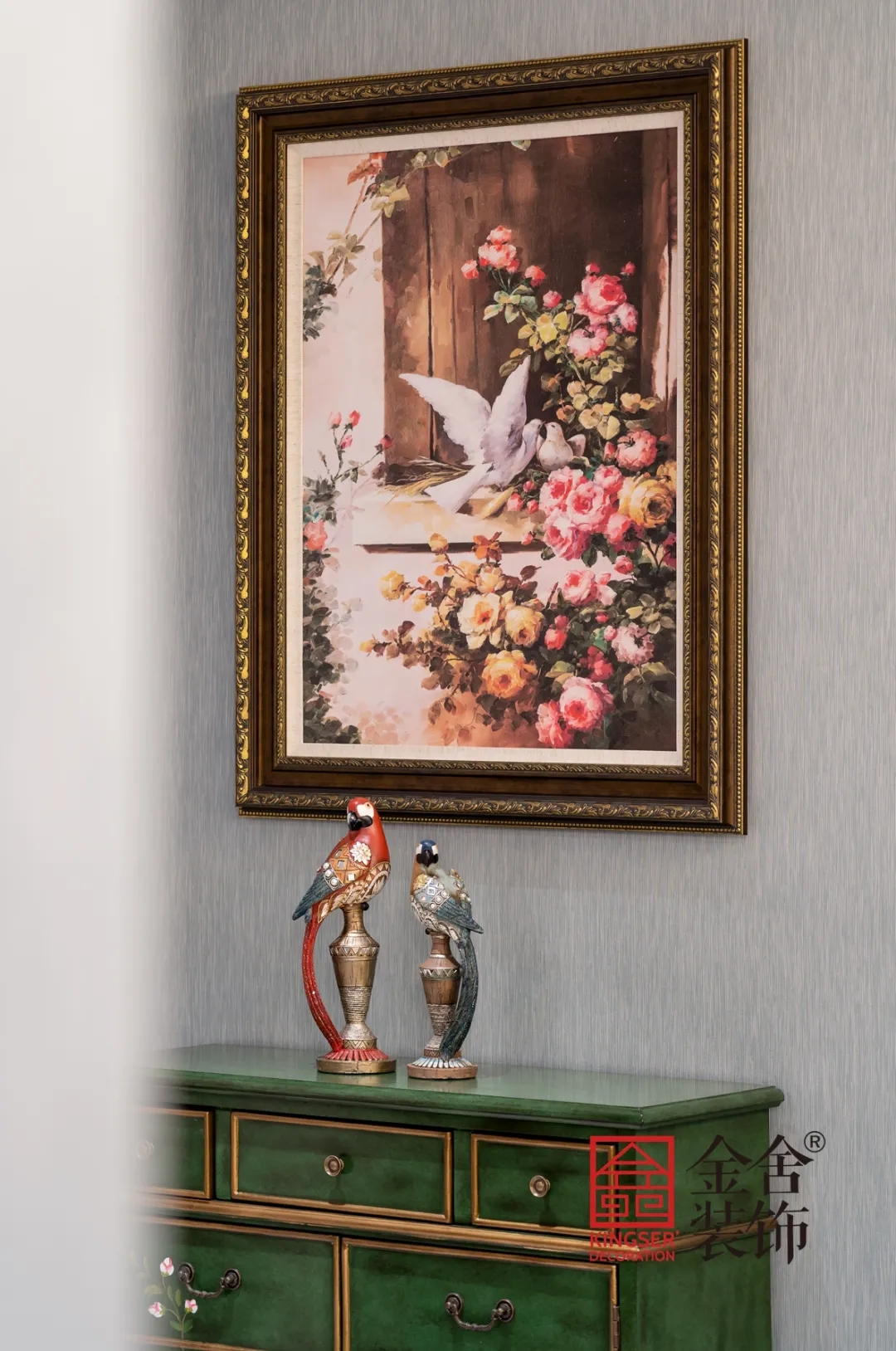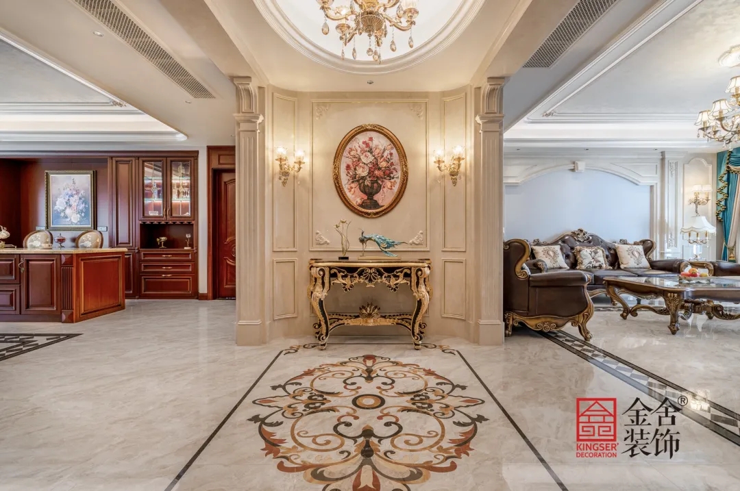 精致細(xì)膩的黑金色雕花玄關(guān)柜,佐以大理石洛可可式的石材線條效果,再加上地面的忍冬草紋飾的花磚,更是讓整個空間充滿了優(yōu)雅古典的氛圍。