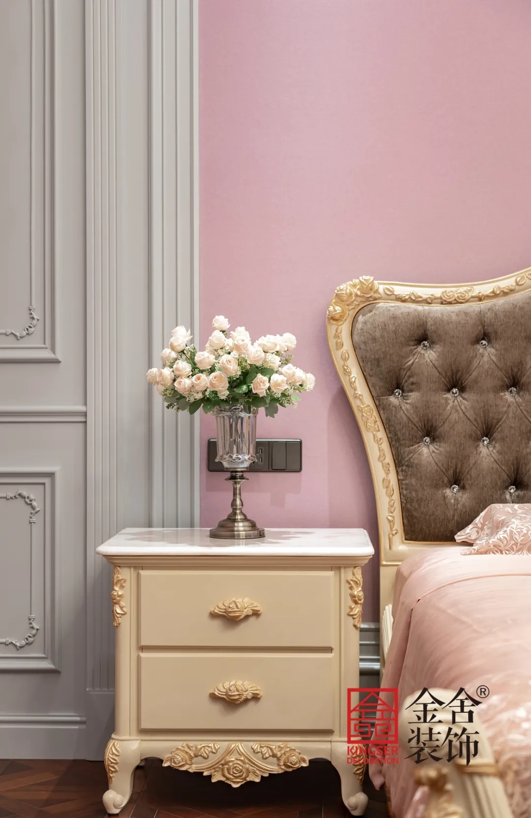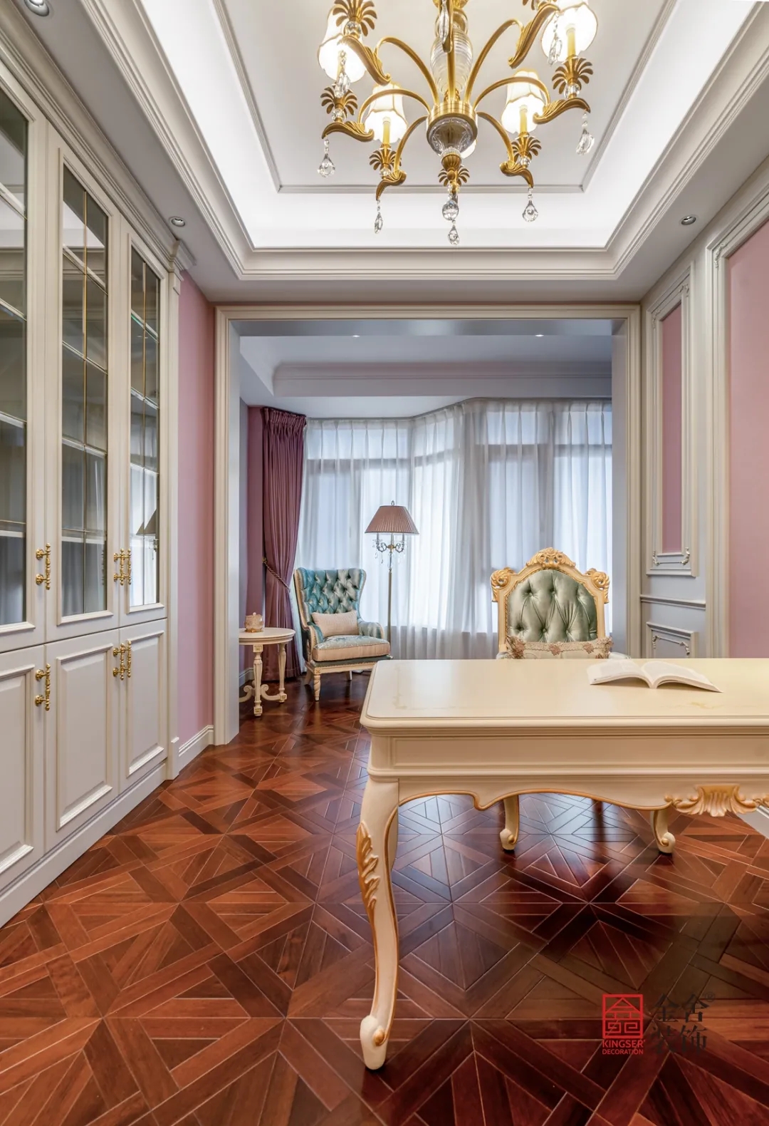 二樓的女兒房也是個套房,女兒房,閱讀室,衛(wèi)生間和一個小的換衣間。滿足了孩子需求的全部功能。在色調(diào)的選擇上,設(shè)計(jì)師選用了以粉色為主,暖色調(diào)更容易營造出一個溫馨的氛圍。柔和的暖色燈光,讓女兒房多了一絲溫馨柔美。