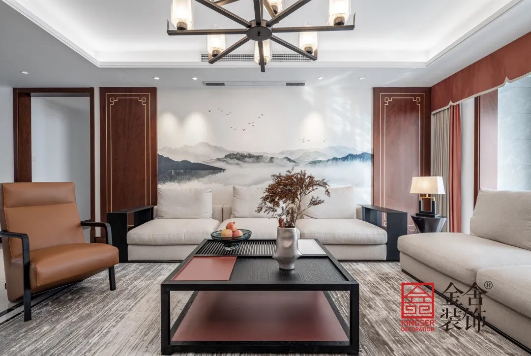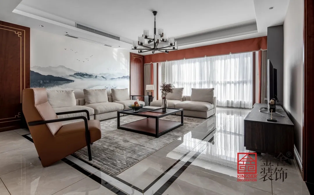 電視墻的山水寫意中山巒孤鴻,氣象萬千,延展出無窮無盡的意象。巧克力色木質(zhì)墻板,銀樺色的地面,線型感十足的吊燈,皮質(zhì)沙發(fā)與布藝沙發(fā)的混搭,可以說家居內(nèi)的每一個(gè)組成都在對你訴說著“東方韻味”的故事。