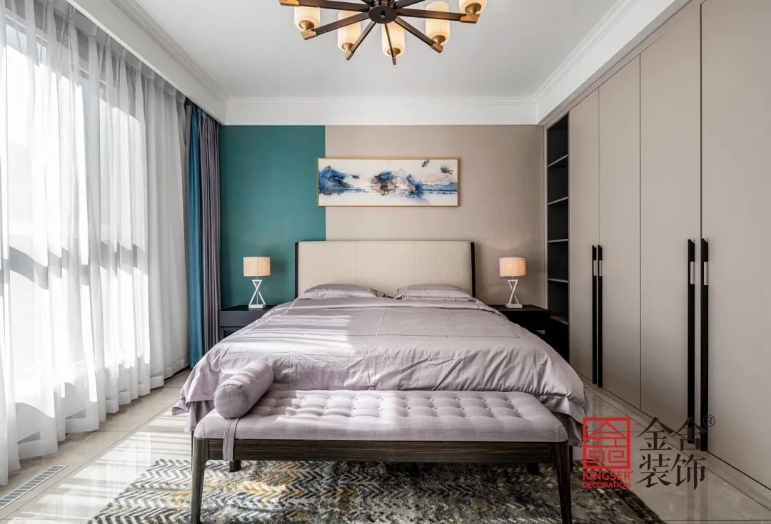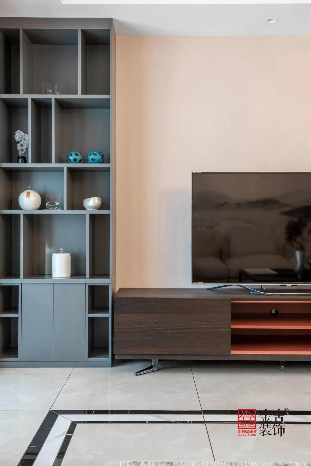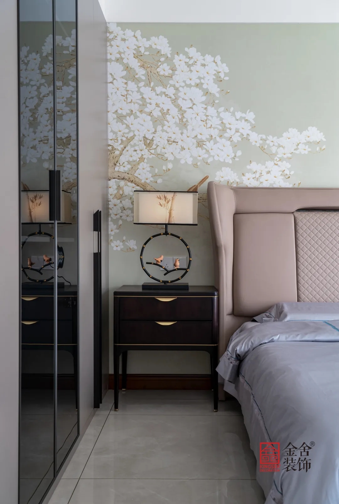 霽青色與銀樺色就是兩個(gè)柔軟而充滿魅力的配色,在空間里中和了中式的嚴(yán)肅,將舒怡的感覺發(fā)揮到了極致。次臥的電視墻用的是淡淡的白描淡彩,突出了中式特有的風(fēng)韻。