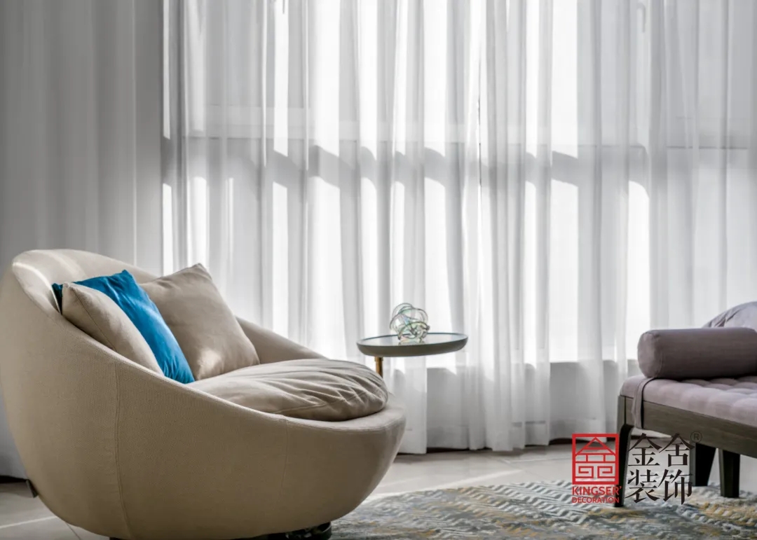 銀樺色的空間中,一抹藍(lán)色的高光將本冷靜的空間煥發(fā)出別樣的感覺,造型柔軟的沙發(fā)正好抵消了空間的冷清。