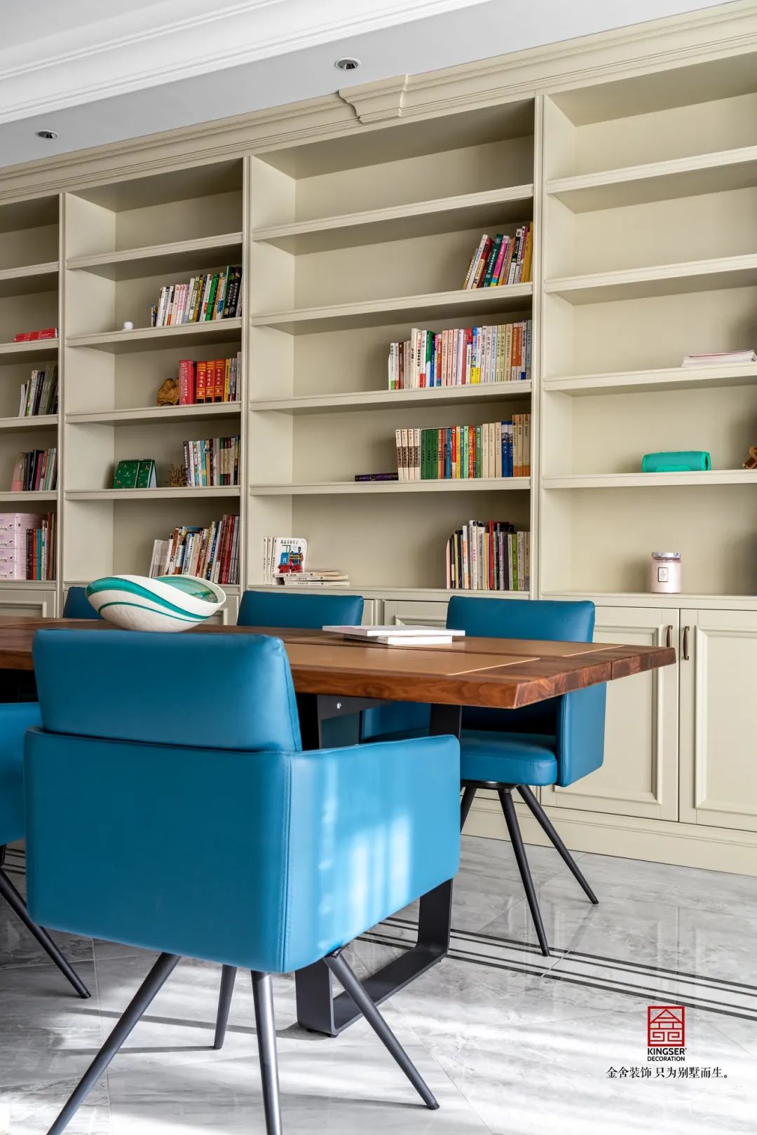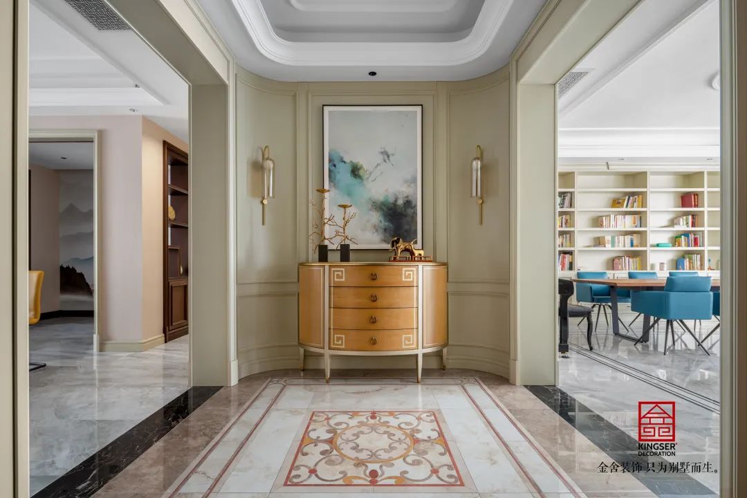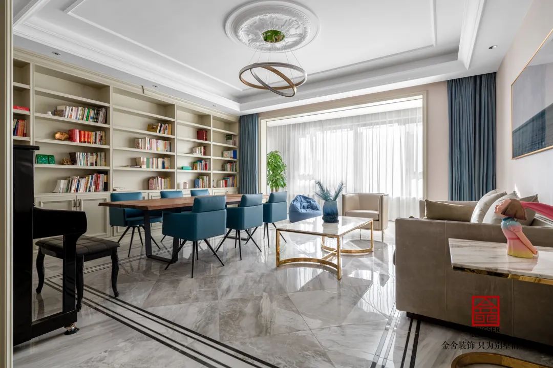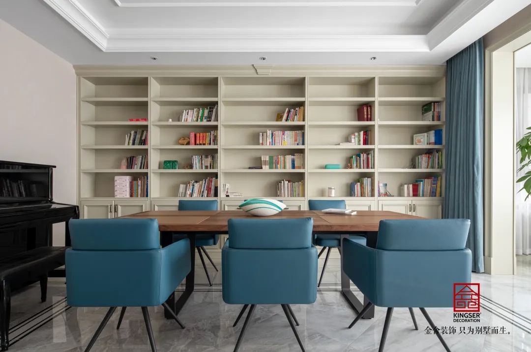 此案例為石家莊室內(nèi)裝修-榮盛華府200平米美式風(fēng)格裝修案例實(shí)景。博爾赫斯曾經(jīng)說(shuō)過(guò):我心里一直在暗暗設(shè)想,天堂應(yīng)該是圖書(shū)館的模樣。在家庭圖書(shū)館中,隨手捧起一本好書(shū),沉浸在文字的世界里,與聰明人進(jìn)行精神交流,這或許就是天堂應(yīng)該有的模樣。