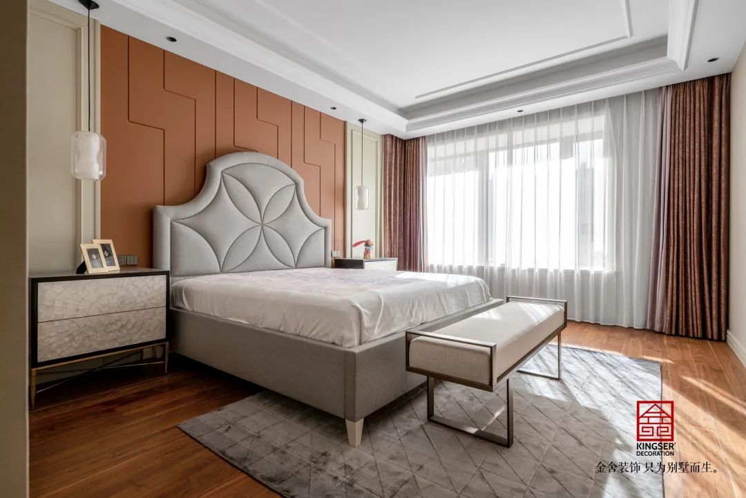 在臥室的設(shè)計(jì)上,強(qiáng)調(diào)的是舒展與放松,沒(méi)有刻意的豪華,但流露出精致的生活情調(diào)。大面積基底的布藝面料、皮革家具的簡(jiǎn)單混搭,讓整個(gè)空間充滿自然神韻。