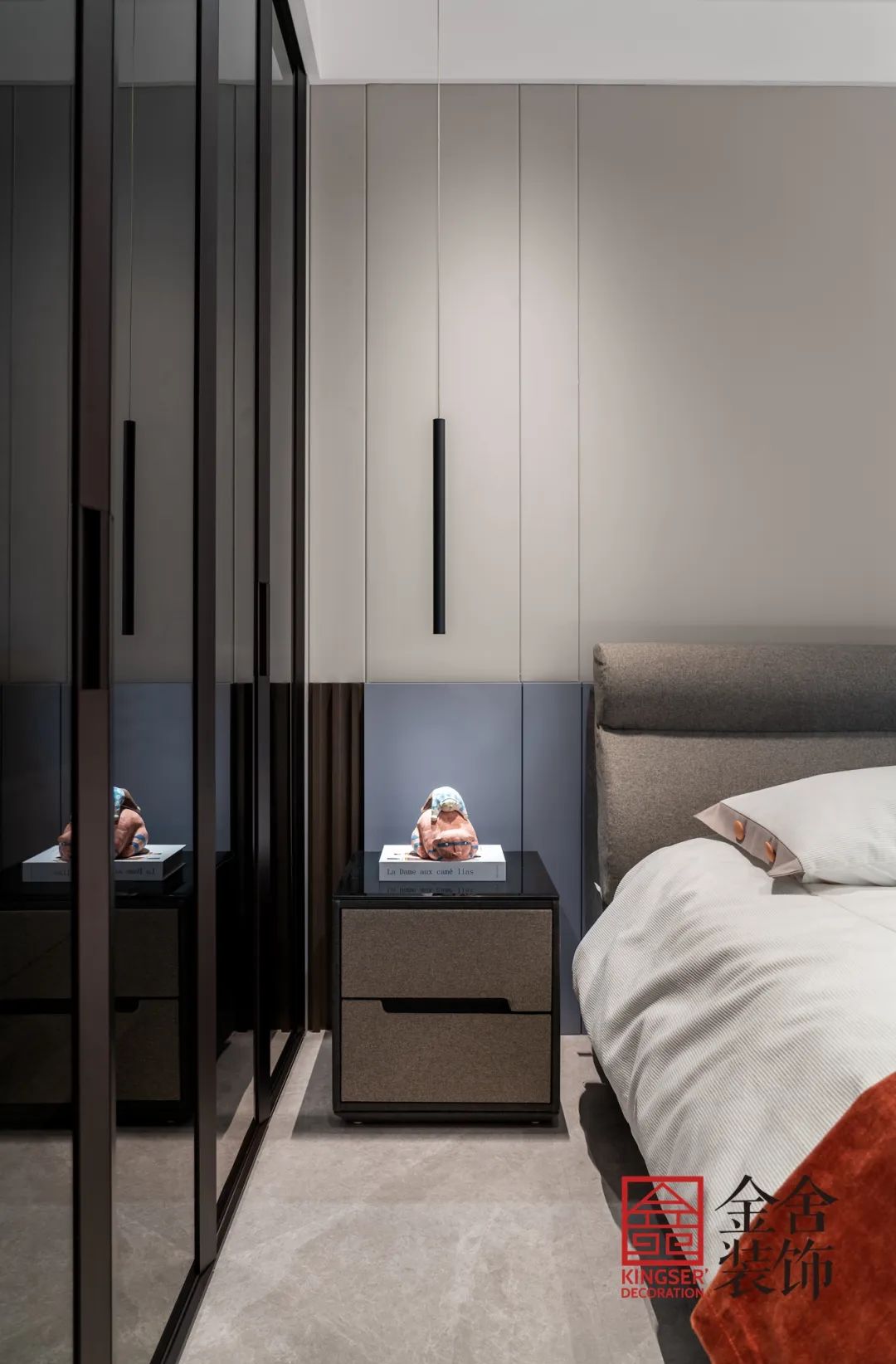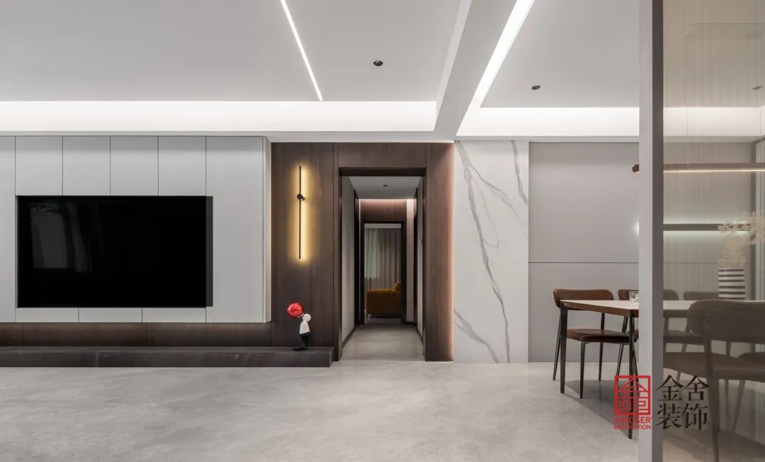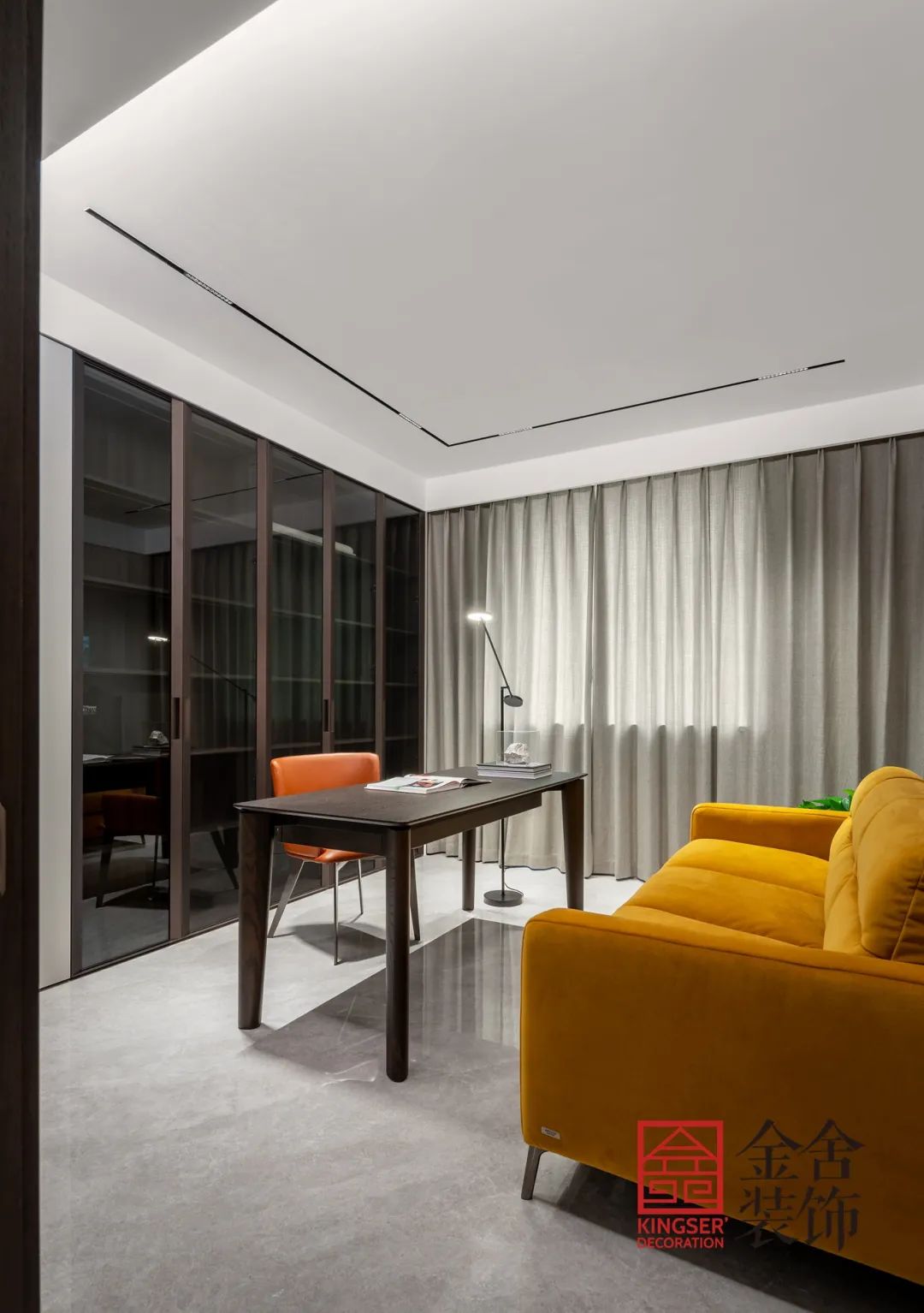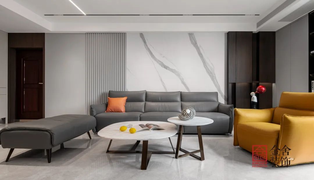 客廳中主要顏色除了灰色之外特別添加了一抹亮色,巖板和硬包的設(shè)計也是將空間塑造出一種奢華低調(diào)的感覺,飛流直下的墨色給人一種爽快而舒適的感覺,無主燈設(shè)計更是將客廳的美感上升了一個新的層次。