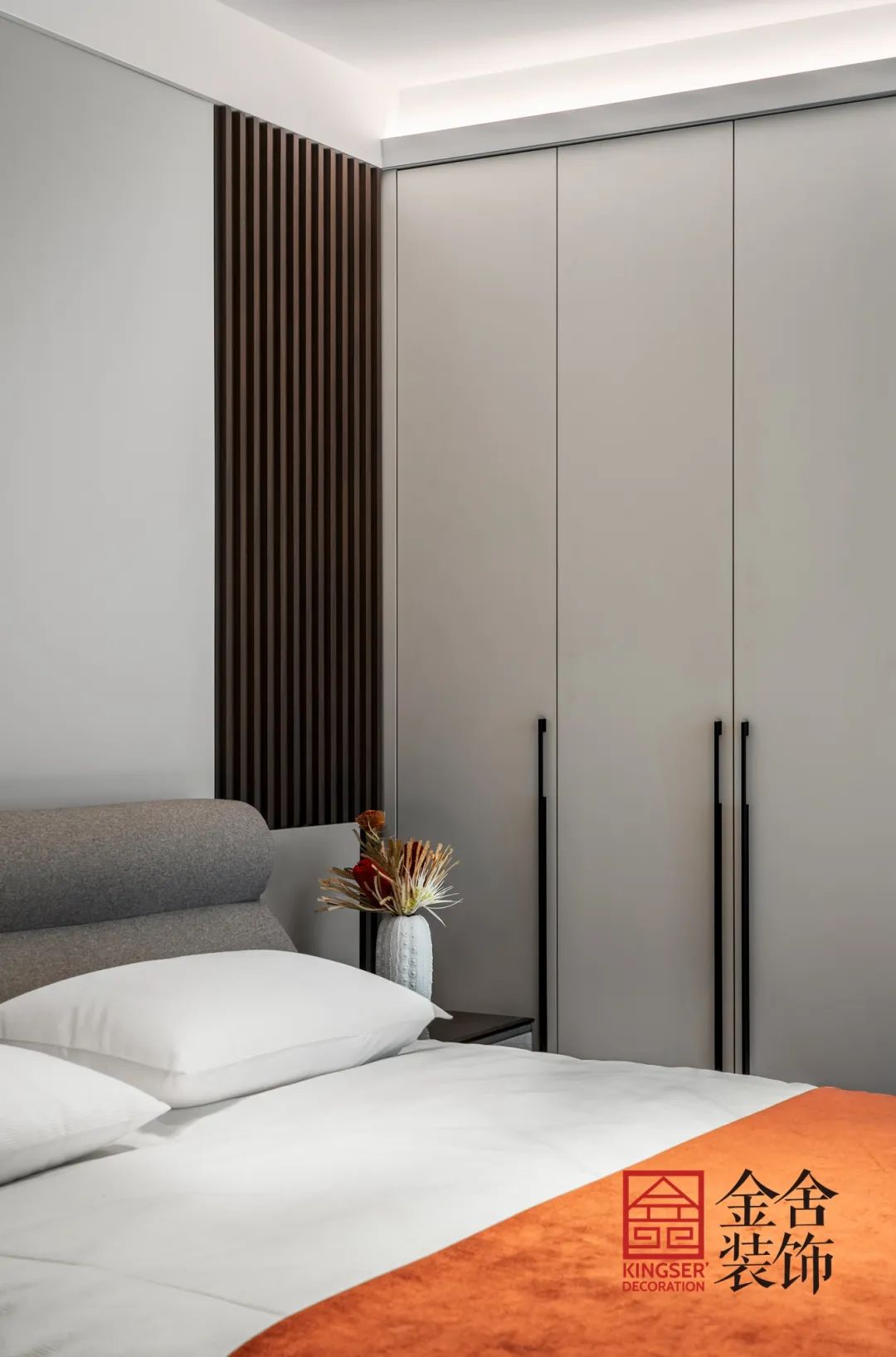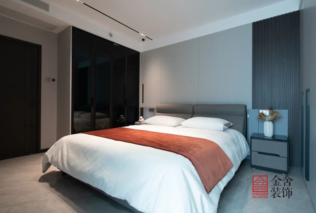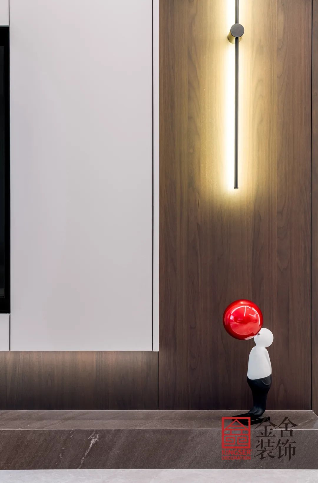 客廳中主要顏色除了灰色之外特別添加了一抹亮色,巖板和硬包的設(shè)計也是將空間塑造出一種奢華低調(diào)的感覺,飛流直下的墨色給人一種爽快而舒適的感覺,無主燈設(shè)計更是將客廳的美感上升了一個新的層次。