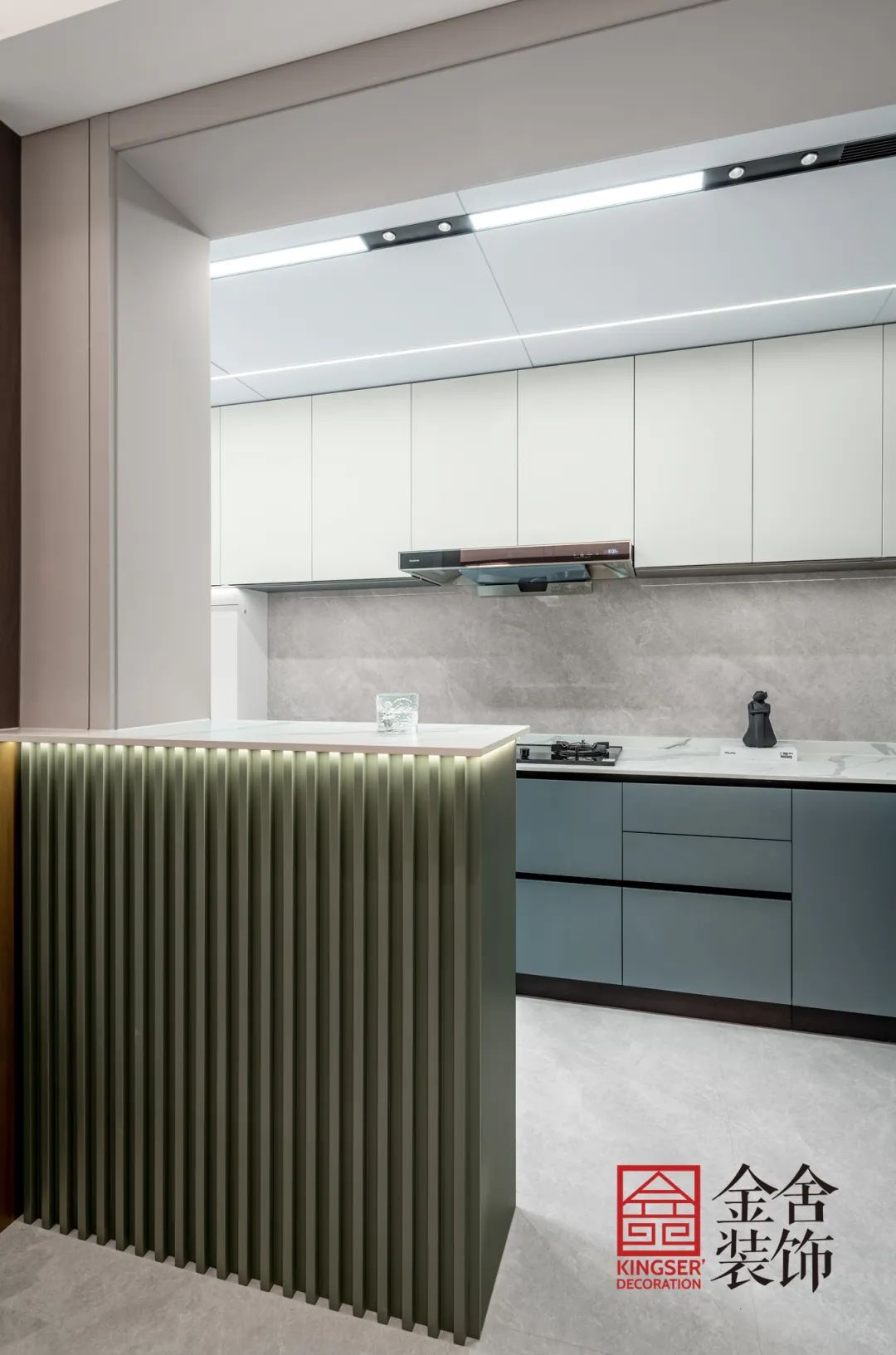 廚房設(shè)計了一個開放式的中廚,用一個吧臺代替了門的位置,起到一個傳菜與休閑的作用。新板材集成吊頂也是讓整個空間增加一點獨特的審美效果。