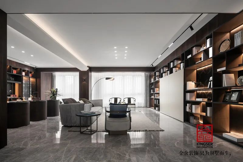 本案為御河上院210㎡新中式風格裝修實景。最大特色就是對于空間的拆改,擴大了空間,將原來的臥室跟客廳打通,建造成了一個巨大的客廳。一般半居家一半茶室,讓整個空間更具功能性,同時將整個家居的格調提升了一個很大的檔次。在風格中將傳統(tǒng)文化元素與現(xiàn)代生活所需完美結合,同時悉心考量主人性格情緒,自然地將中式味道中的力量呈現(xiàn)。