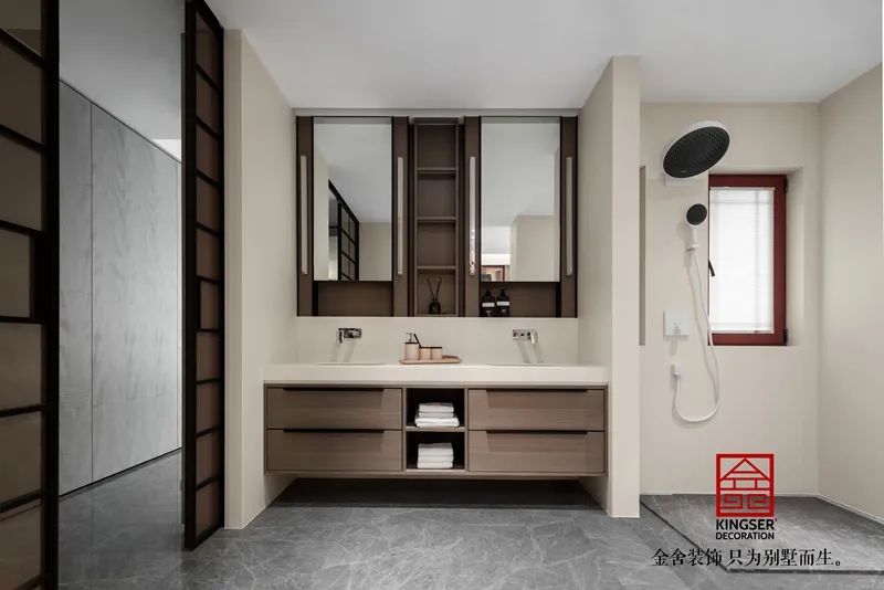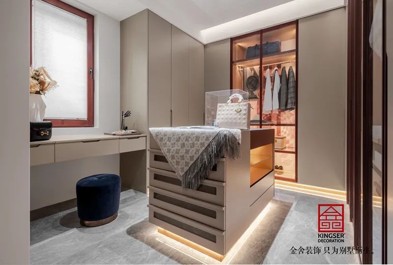 優(yōu)美典雅感的水墨細描與傳統(tǒng)的中式家具,山水清新墻面畫作、蘊含著東方之美的“端正方整”之體態(tài),傳統(tǒng)的木,傳統(tǒng)的風,端莊又不失風雅,窗外錯落的光影,打進來點點光束,生活莫過于此。契合女主人對于穿著和配搭的講究,特別在衣帽間的中央設置了一個中間的展示臺,一些奢侈品都可以在這里展示。同時也方便業(yè)主的取放。