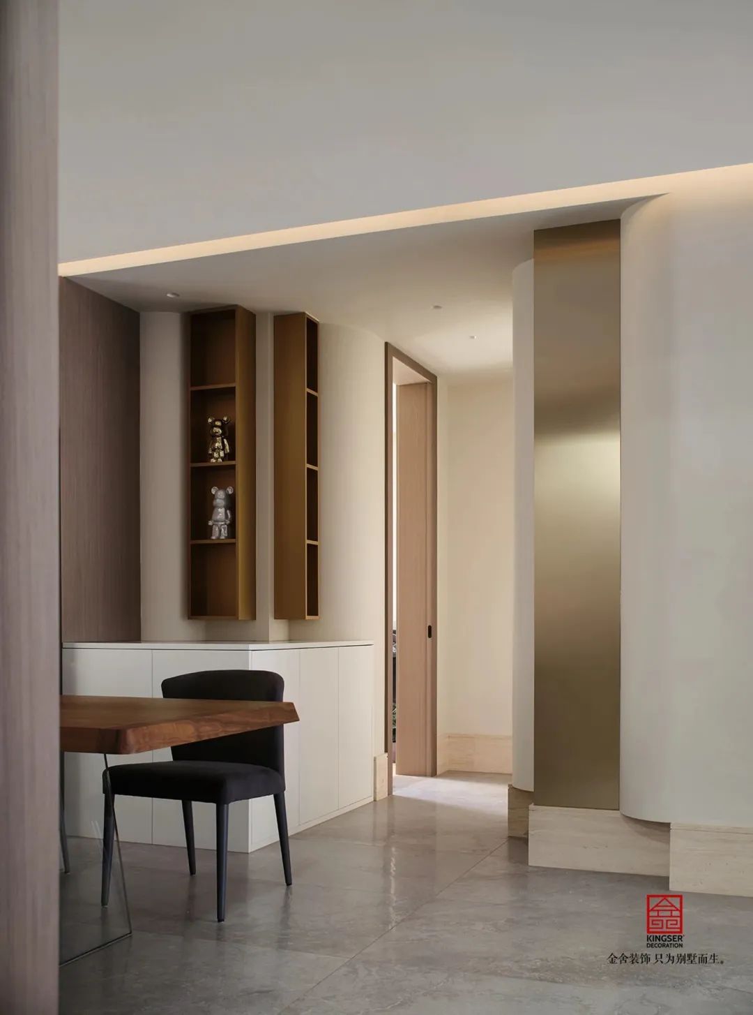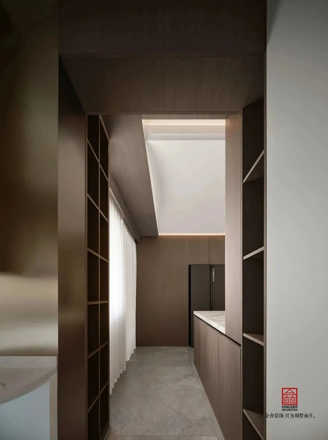 純粹且樸素的空間中,干凈利落的線條,沒有任何冗余的裝飾,偶爾照射進來的層疊光影,賦予空間靈動自然之美。