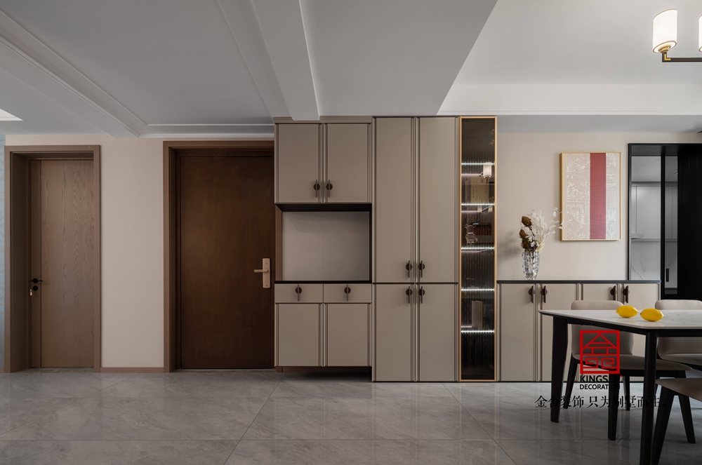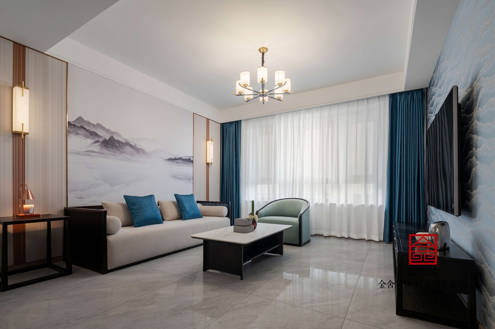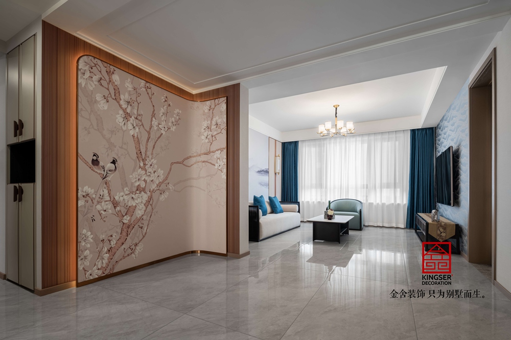 此案例為金舍裝飾-東南智匯城165平米新中式風(fēng)格裝修實(shí)景。客廳是沒有陽臺的所以說采光是這個(gè)戶型的比較大的一個(gè)痛點(diǎn),結(jié)合這個(gè)原因,設(shè)計(jì)師沒有用一些傳統(tǒng)的墻板來做這樣的造型,而是采用了肌理感非常強(qiáng)的維詩康的壁布來做造型,環(huán)保性非常強(qiáng),顏色的選擇也很多,本案選擇的顏色是琥珀金色,比較貼合新中式的風(fēng)格