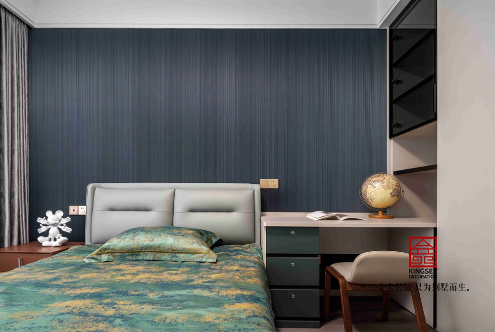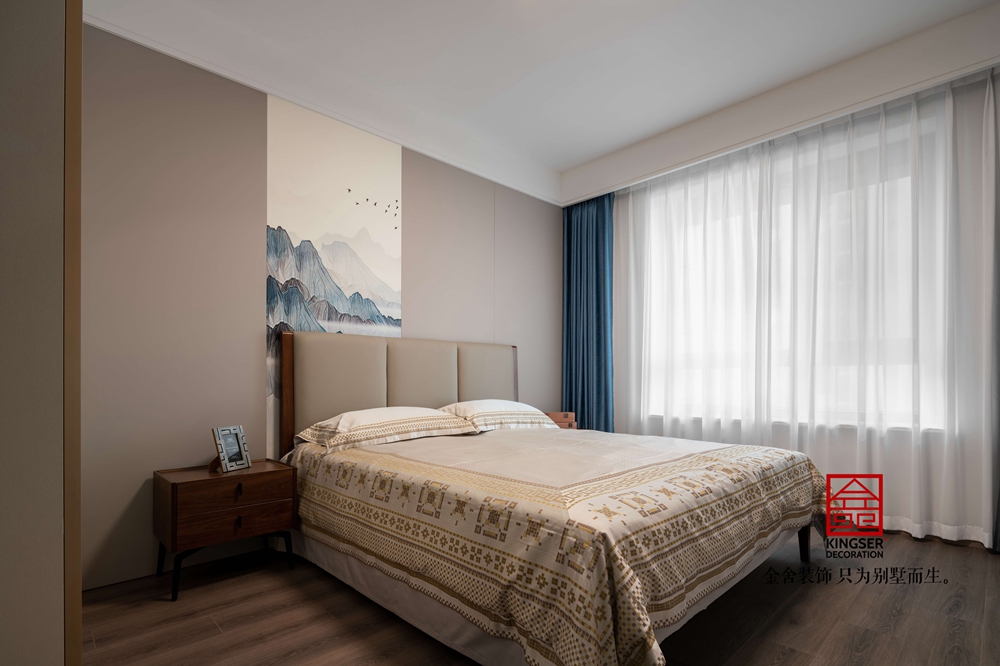 主臥采用理性的方格背景鋪陳層次,賦予空間沉穩(wěn)靜謐的基調(diào),而用材用色自然干凈又打破這一冷凝感,讓整個(gè)空間充滿舒適安然風(fēng)情。優(yōu)雅的弧形像畫筆一般輕盈游走,靈動(dòng)灑脫,使空間豐潤有度讓人心生柔軟自然放松。