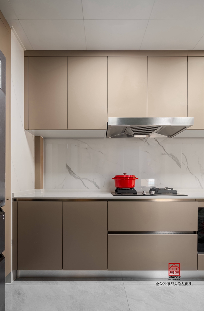 沙發(fā)墻這兩側(cè)壁布選的是一個(gè)米灰色和這個(gè)琥珀色的一個(gè)對照,解決了采光的問題,顯得這個(gè)空間會更靈動(dòng)一些