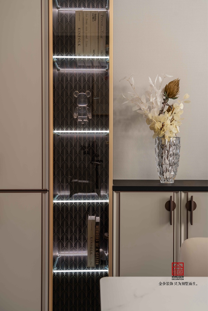 自然靈動(dòng)的材質(zhì)與樸素之色相互輝映,米色空間里琥珀色與藍(lán)色點(diǎn)綴其中,設(shè)計(jì)師以當(dāng)代語言演繹傳統(tǒng)東方美學(xué)