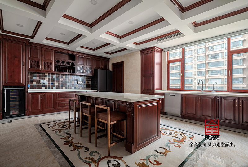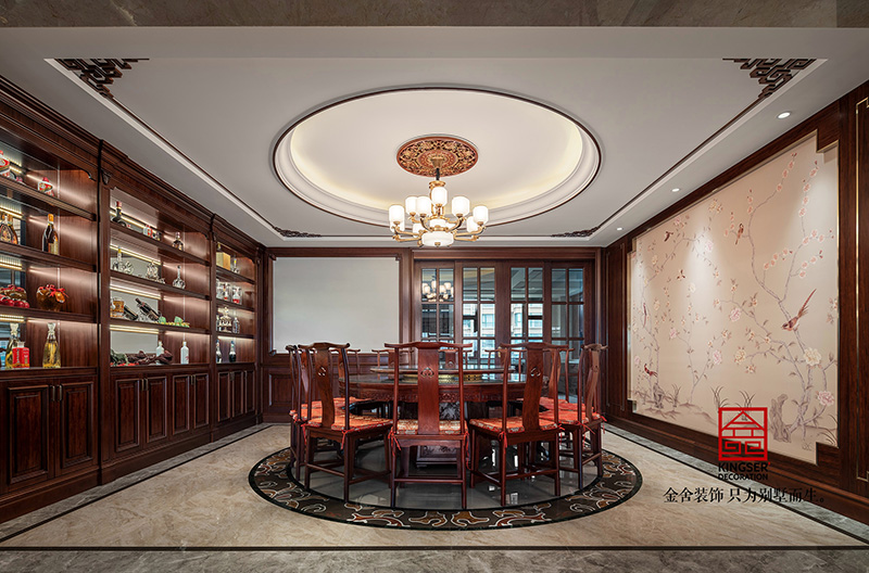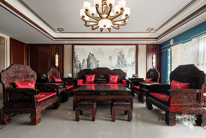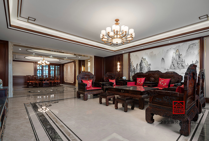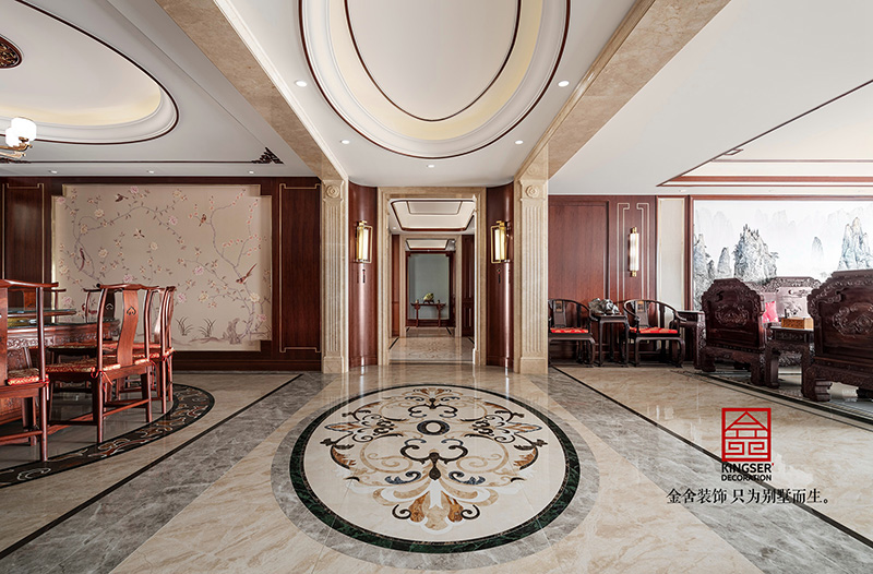 金舍裝飾-天下玉苑500平中式風(fēng)格實(shí)景拍攝,奢華大氣的超大平墅,走廊長度達(dá)到17米,貫穿客餐廳,休閑區(qū),以及三個(gè)臥室,氣宇非凡??蛷d采用大紅酸枝的13件套,品質(zhì)上乘,沙發(fā)細(xì)節(jié)的祥云圖案,纏枝蓮紋手工打造,茶幾的圖案選用松鶴延年,四周是梅蘭竹菊,象征著長壽和健康,也寓意著吉祥和祥瑞。