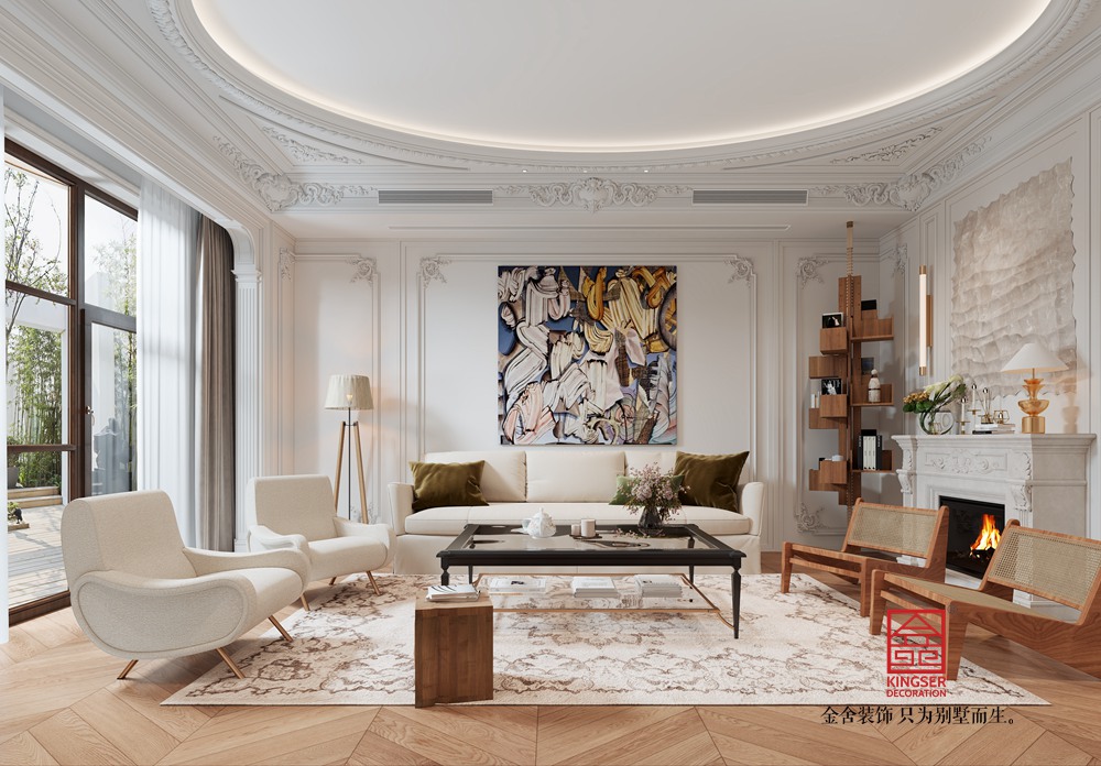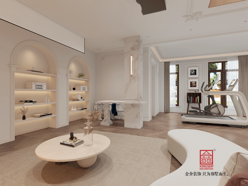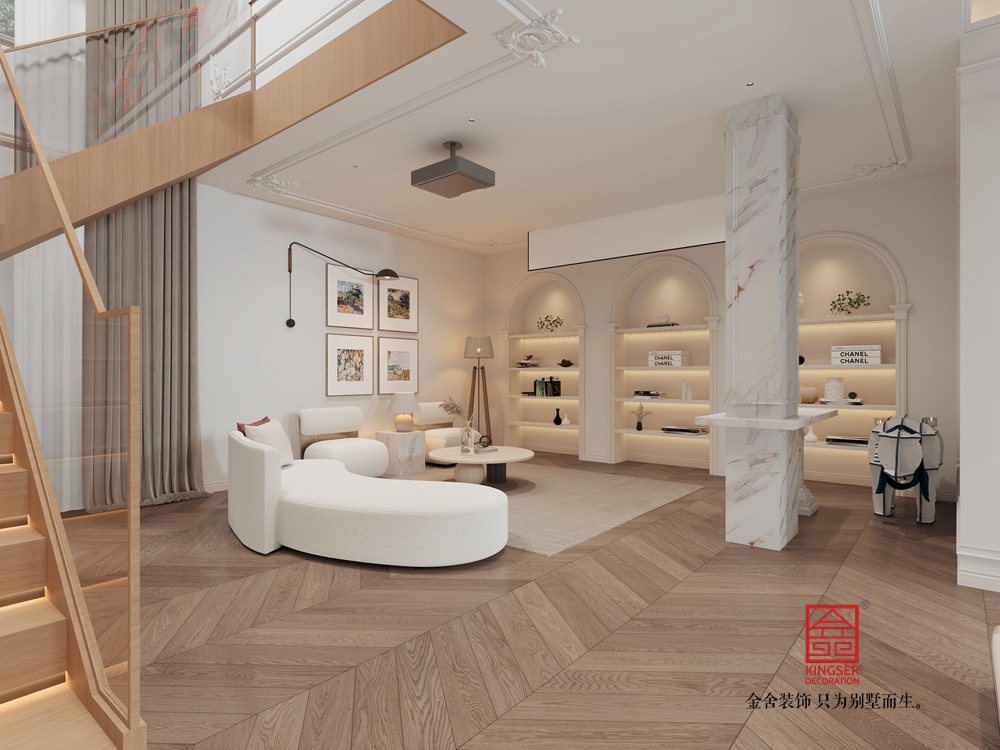 此案例為石家莊裝修公司-西山林語260平米輕奢風(fēng)格裝修效果圖。本設(shè)計方案旨在打造一個現(xiàn)代風(fēng)格的客廳空間,以白色為主色調(diào),營造出一種簡約而不失溫馨的氛圍。客廳的地面采用木質(zhì)地板,不僅增添了自然質(zhì)感,也提升了整個空間的舒適度。