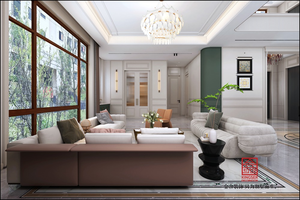 客廳內(nèi)部裝飾豪華,以白色和米色為主色調(diào)??蛷d中央有一張大型的白色沙發(fā),沙發(fā)上鋪有灰色的抱枕。沙發(fā)旁邊是一張長(zhǎng)方形的木質(zhì)茶幾,上面擺放著一些裝飾品和書籍。在沙發(fā)對(duì)面,有一個(gè)帶有玻璃門的壁爐,壁爐上方掛著一幅畫??蛷d的一側(cè)是一個(gè)開放式的廚房區(qū)域,可以看到一個(gè)黑色的鋼琴和一架梯子。整個(gè)房間通過大窗戶引入自然光線,窗外是樹木和建筑。天花板上懸掛著一盞圓形吊燈,為空間增添了溫暖的氛圍。整體來看,這個(gè)客廳設(shè)計(jì)寬敞、明亮且具有現(xiàn)代感。