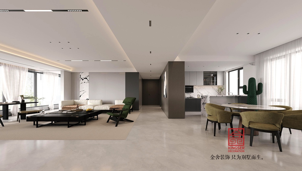 此案例為石家莊裝修公司-交投高新苑229平米現(xiàn)代簡(jiǎn)約風(fēng)格裝修效果圖,客廳設(shè)計(jì)以現(xiàn)代簡(jiǎn)約風(fēng)格為主調(diào),融合功能性與美學(xué)。整體色調(diào)沉穩(wěn),灰色系墻面搭配黑色家具,營(yíng)造出冷靜大氣氛圍。綠色單椅作為視覺亮點(diǎn),增添生機(jī)。