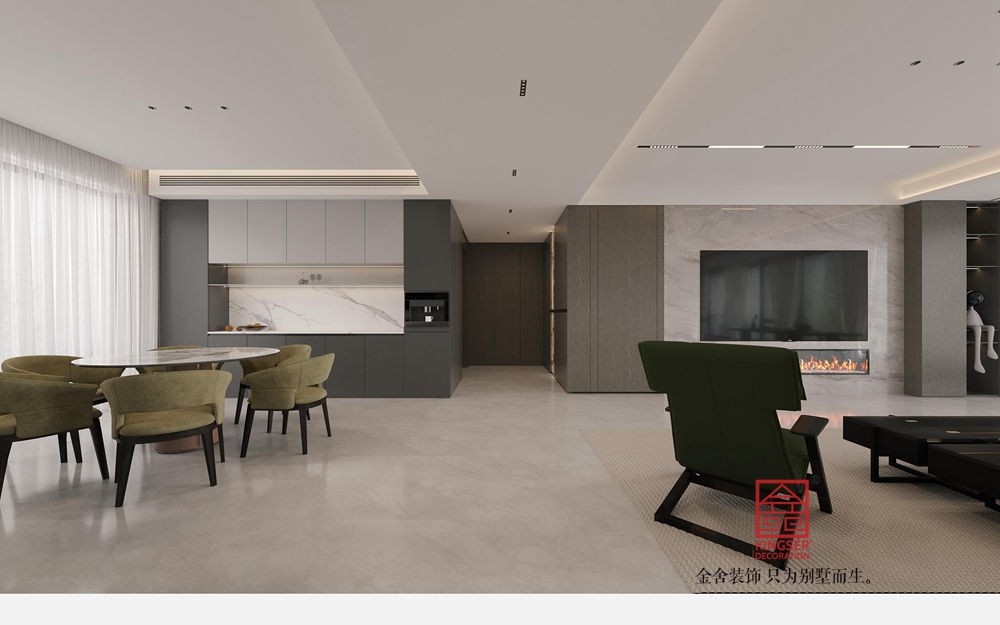 電視背景墻采用大理石材質(zhì),質(zhì)感十足,下方的仿真壁爐設(shè)計(jì),為空間注入溫暖感。無(wú)主燈設(shè)計(jì)結(jié)合筒燈、燈帶,光線層次豐富且柔和。開放式廚房與客廳相連,增強(qiáng)空間通透感與互動(dòng)性。茶桌、茶具與窗邊茶臺(tái)的布置,體現(xiàn)對(duì)品質(zhì)生活與休閑時(shí)光的追求。