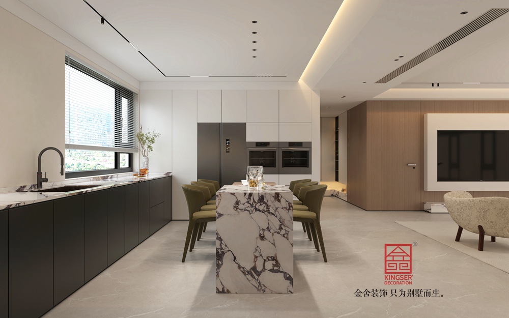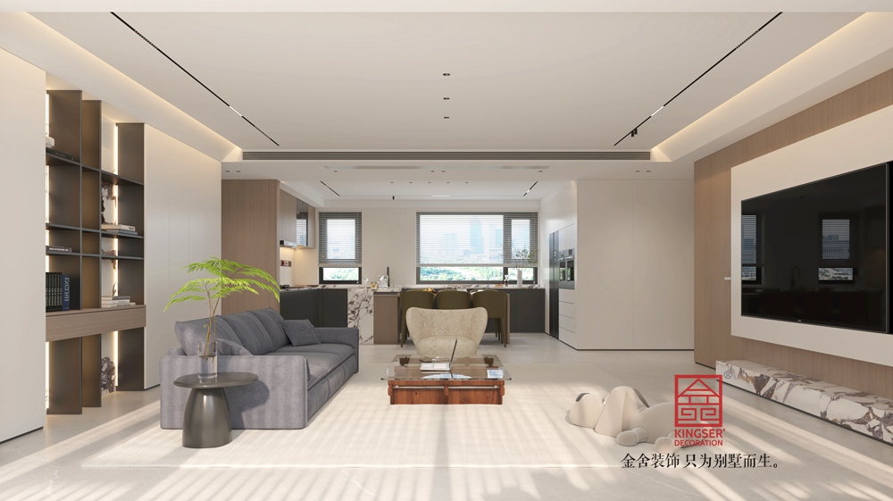 本客廳采用開放式布局,空間開闊流暢,打破傳統(tǒng)分隔,使客廳與相鄰功能區(qū)(如餐廚區(qū))自然融合,增強(qiáng)空間互動性與通透感,滿足現(xiàn)代生活多元需求。