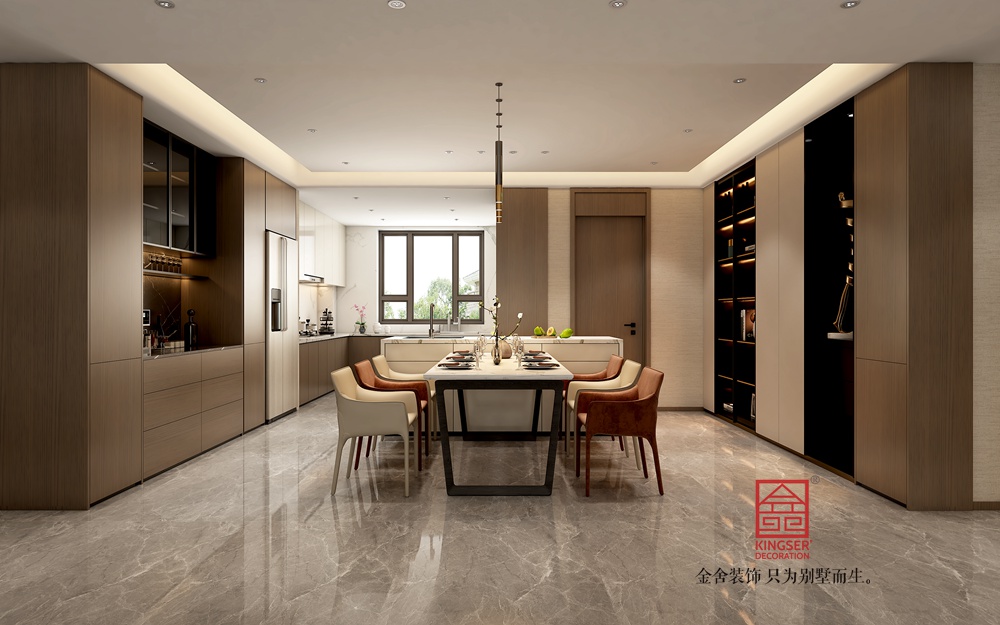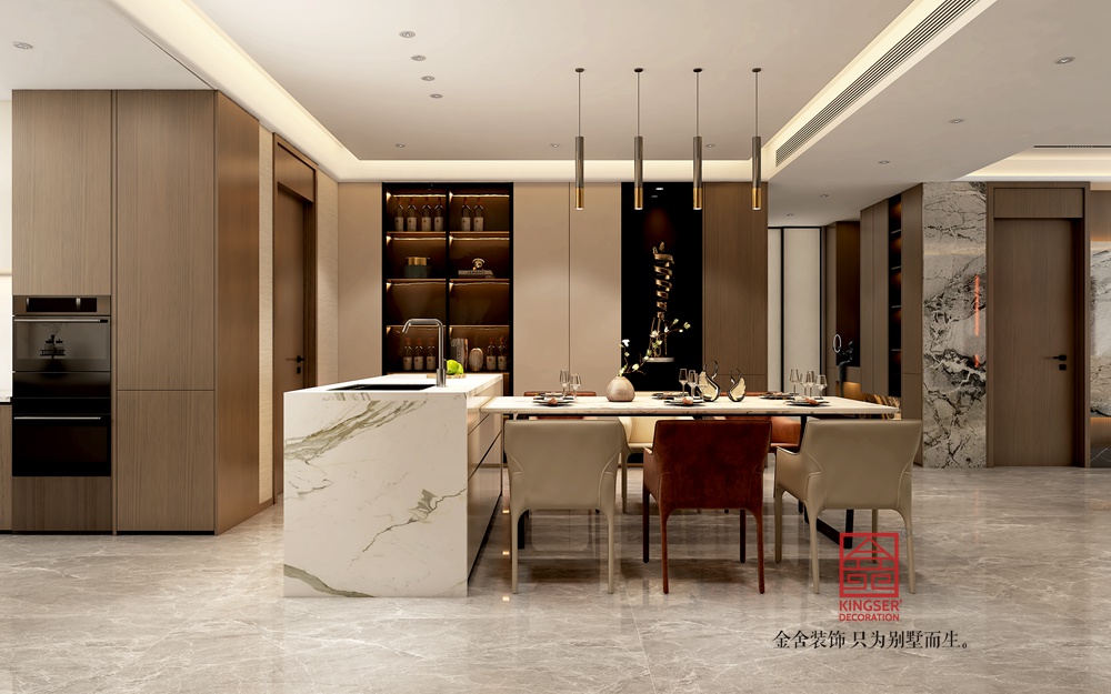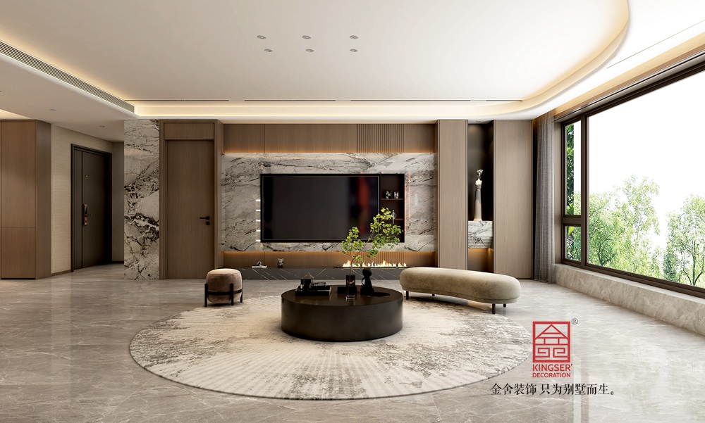 以開(kāi)放流暢為原則,弧形沙發(fā)呼應(yīng)天花板線(xiàn)條,打破規(guī)整邊界,圍合出交流核心區(qū)。圓形茶幾居中,弱化棱角,讓空間互動(dòng)更自然,適配別墅大宅的社交屬性,同時(shí)留出開(kāi)闊動(dòng)線(xiàn),銜接窗外景觀與室內(nèi)起居。