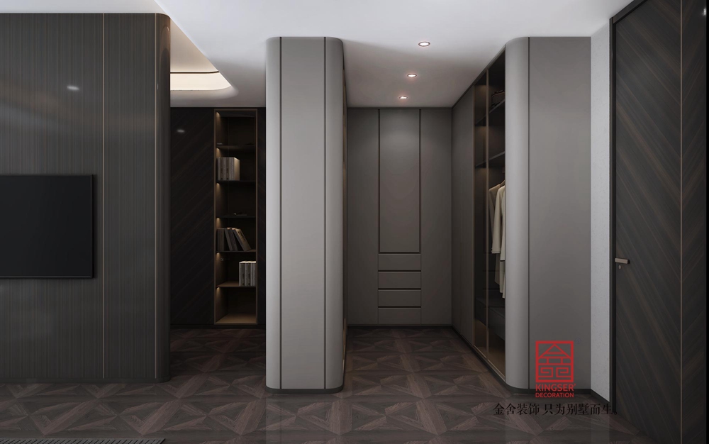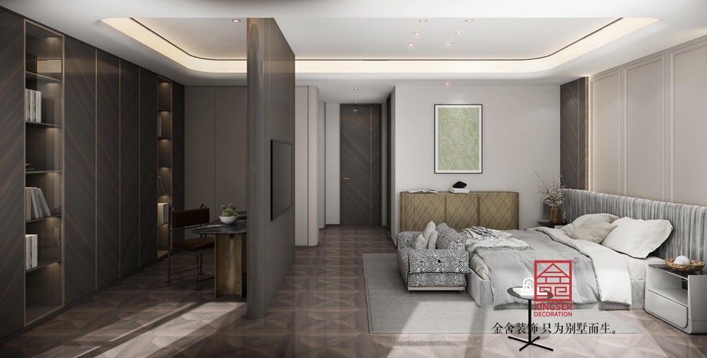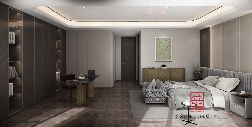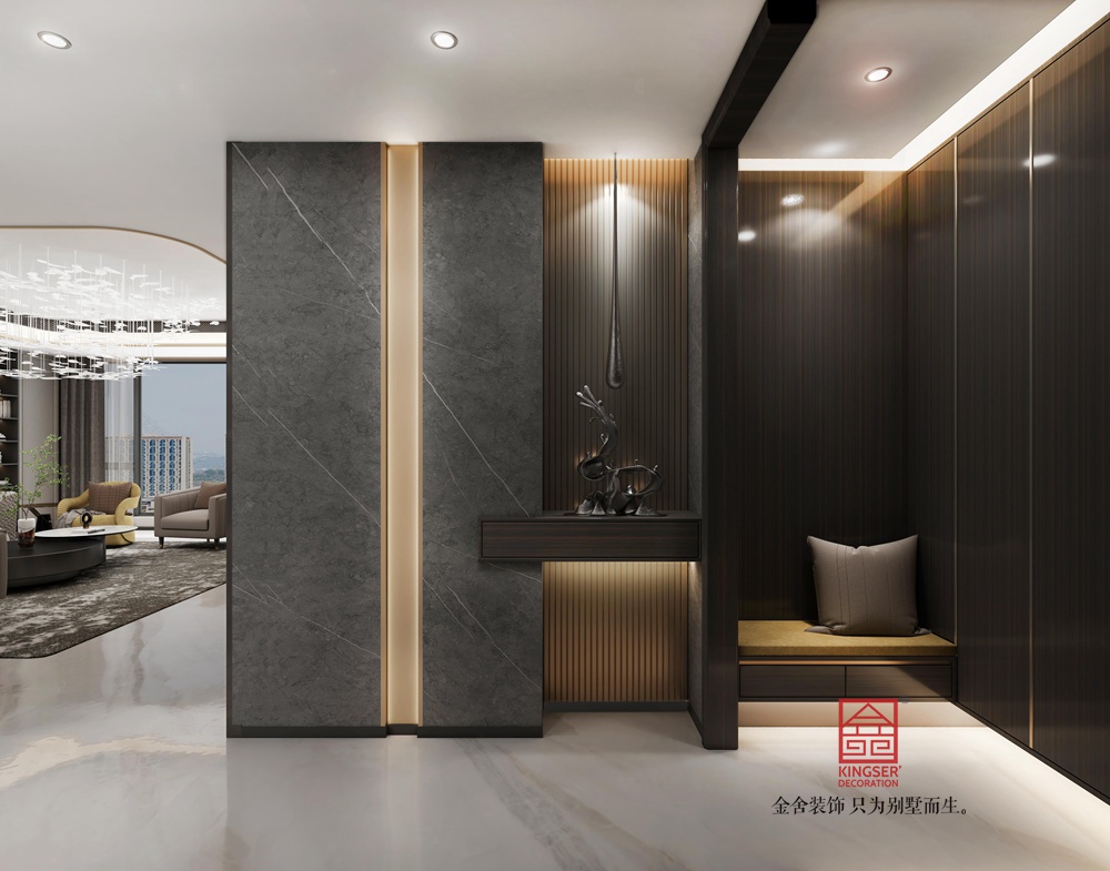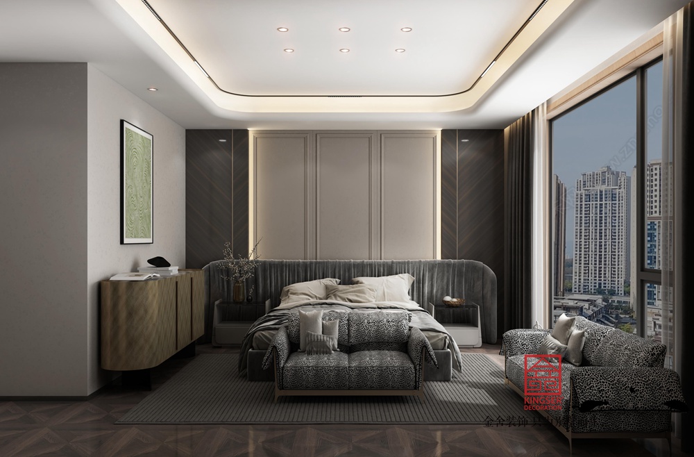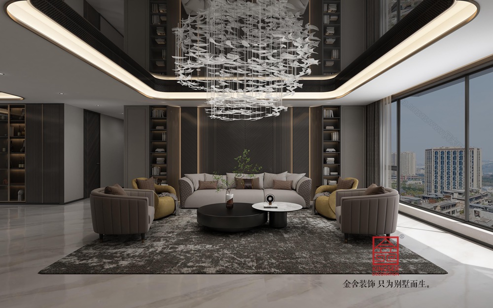 設(shè)計說明: 空間布局上,開放式格局連通視覺,大窗引入城市景觀,拓展視野與采光。頂面采用懸浮吊頂,搭配線性燈光,結(jié)合藝術(shù)感十足的白色創(chuàng)意吊燈,塑造精致氛圍。墻面以深灰為主調(diào),電視背景墻用金屬線條勾勒,強化輕奢質(zhì)感,兩側(cè)深色木質(zhì)護墻增添層次。
