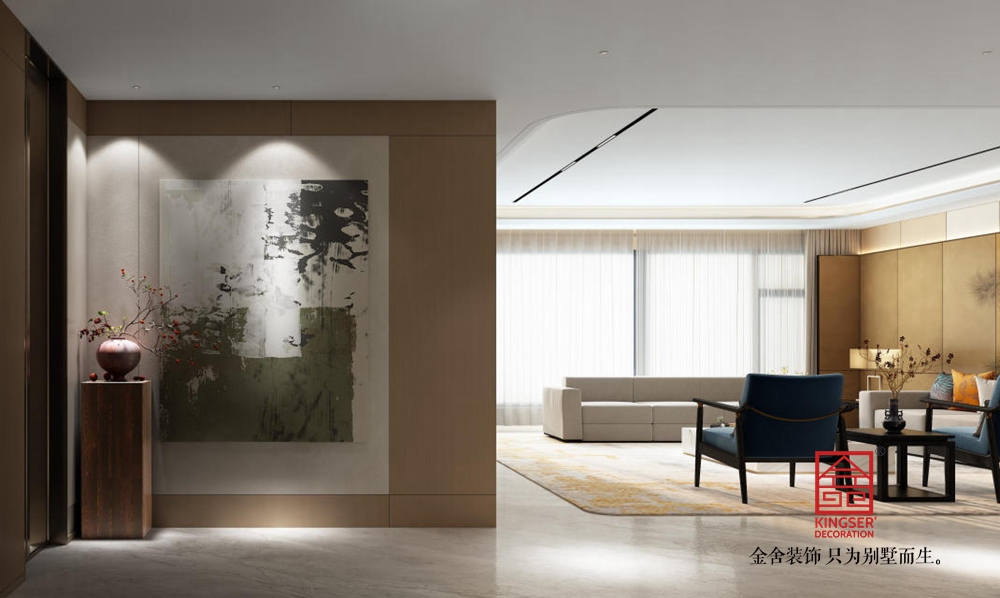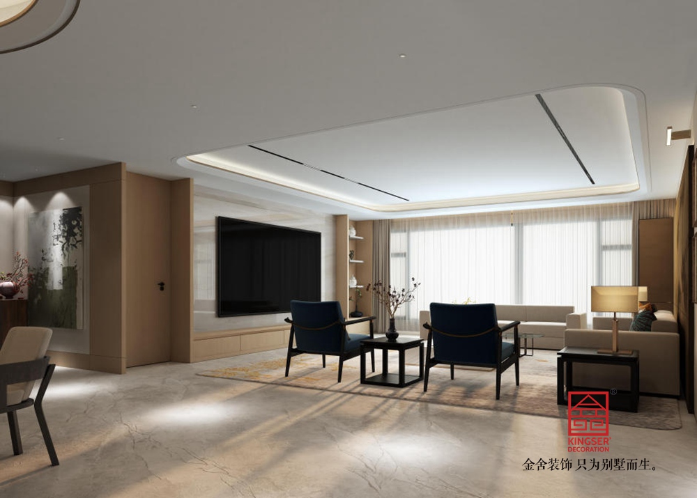 該客廳設(shè)計為新中式風(fēng)格,融合傳統(tǒng)韻味與現(xiàn)代簡約。以淺米、暖棕為主色調(diào),營造溫潤雅致氛圍。頂面懸浮式造型搭配線性燈,簡潔大氣又具層次感。