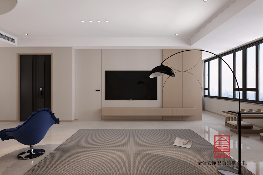 家具選擇上,淺灰沙發(fā)搭配色彩點(diǎn)綴的抱枕,與藍(lán)色休閑椅形成視覺對(duì)話,既保證了舒適的使用體驗(yàn),又豐富了空間層次。簡(jiǎn)約的落地?zé)艉碗娨暠尘皦υO(shè)計(jì),在滿足功能需求的同時(shí),讓空間保持利落通透。整體布局開闊,動(dòng)線流暢,于簡(jiǎn)約之中盡顯雅致與實(shí)用,為居者打造出一個(gè)放松身心、享受生活的理想場(chǎng)所。