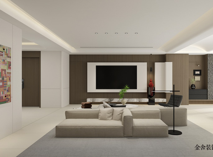 布局上,寬敞的米色組合沙發(fā)提供了舒適的休憩區(qū)域,圍繞著電視背景墻展開,形成核心交流空間。背景墻設(shè)計(jì)簡(jiǎn)潔大方,嵌入式電視與周圍裝飾和諧相融。 裝飾細(xì)節(jié)頗具巧思,左側(cè)色彩豐富的藝術(shù)畫作,為空間注入活力與藝術(shù)氣息;角落的綠植和獨(dú)特?cái)[件,點(diǎn)綴出自然生機(jī)與個(gè)性品味。