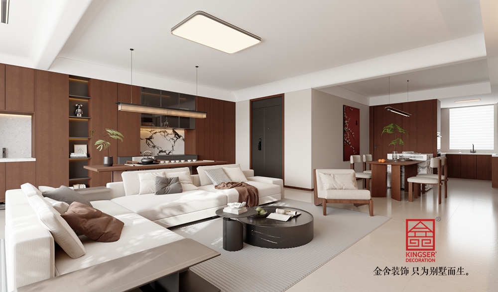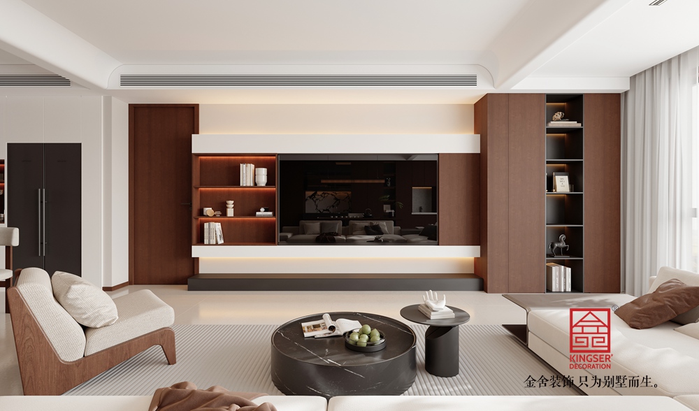 此客廳設(shè)計(jì)主打現(xiàn)代簡(jiǎn)約與自然質(zhì)感的融合。以淺色系為空間基底,搭配深棕色木質(zhì)柜體,營(yíng)造出溫暖且雅致的氛圍。