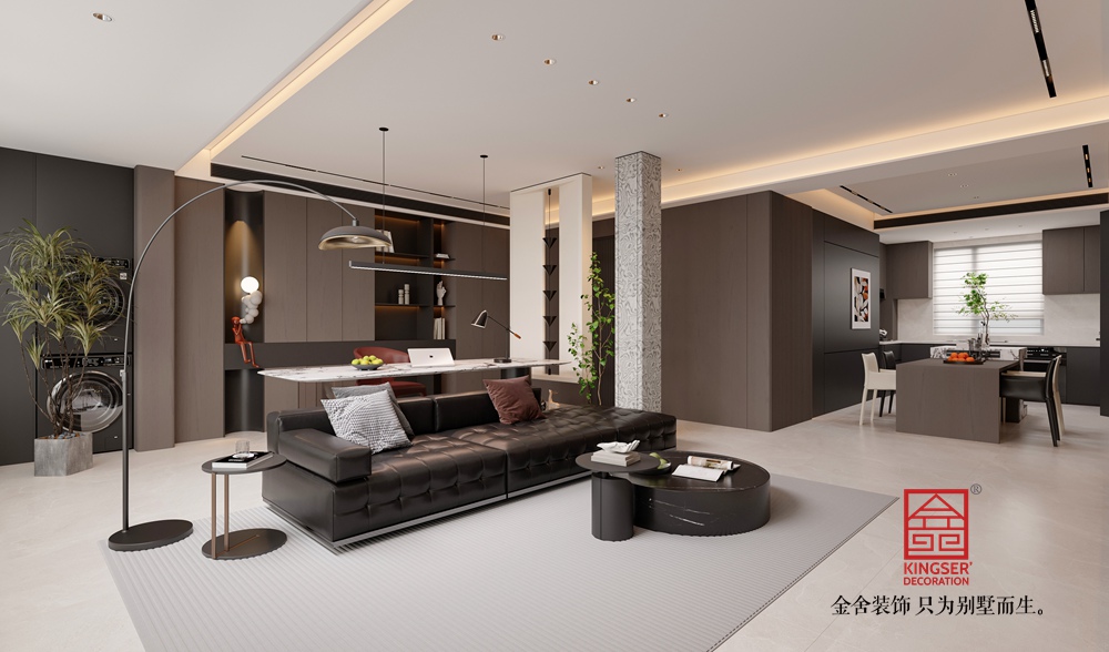 地面淺色系地毯搭配黑色圓形茶幾,形成鮮明視覺對(duì)比,簡潔又富有設(shè)計(jì)感。一側(cè)造型獨(dú)特的裝飾架,陳列著各式擺件,增添了空間的藝術(shù)氣息。整體布局簡潔大方,光線運(yùn)用巧妙,營造出舒適且極具格調(diào)的客廳環(huán)境,盡顯現(xiàn)代都市生活的精致與從容。
