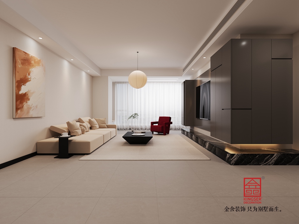 以柔和的米白色為主色調(diào),搭配黑色幾何茶幾的利落線條,再點(diǎn)綴紅色單人椅的視覺(jué)焦點(diǎn),形成冷暖與輕重的平衡;墻面的藝術(shù)掛畫(huà)、紙質(zhì)球形吊燈,傳遞出自然質(zhì)樸的侘寂感,讓空間在簡(jiǎn)約中蘊(yùn)含細(xì)膩溫度。