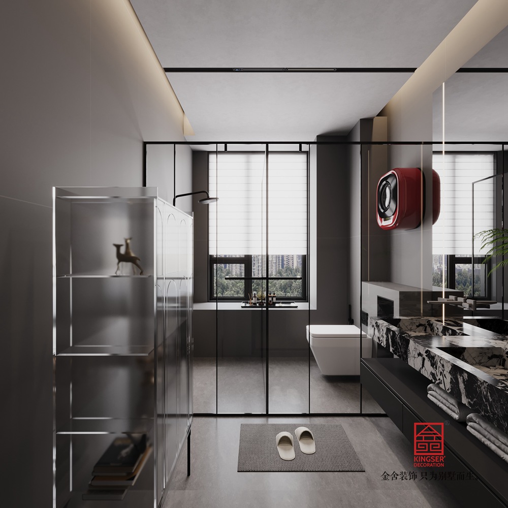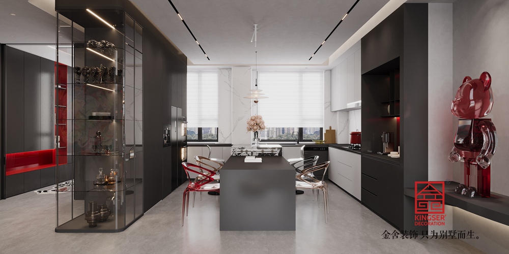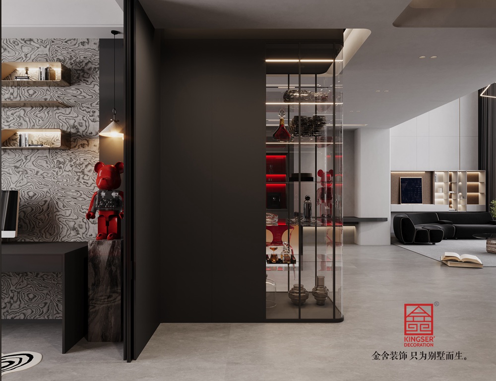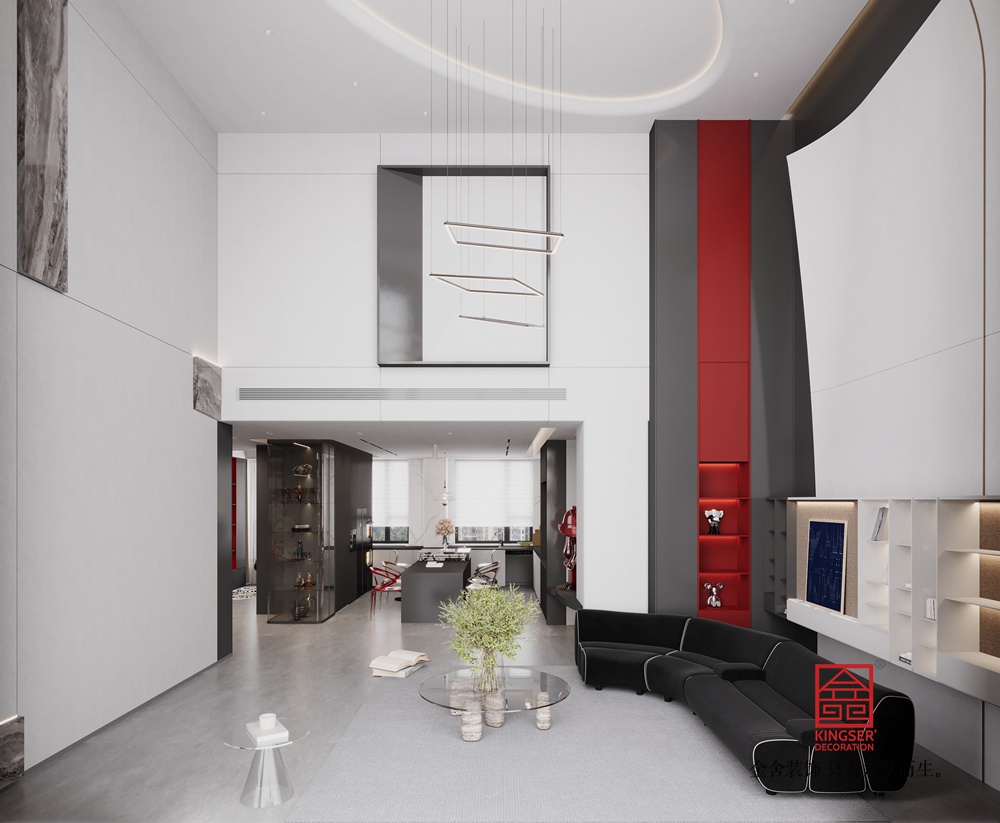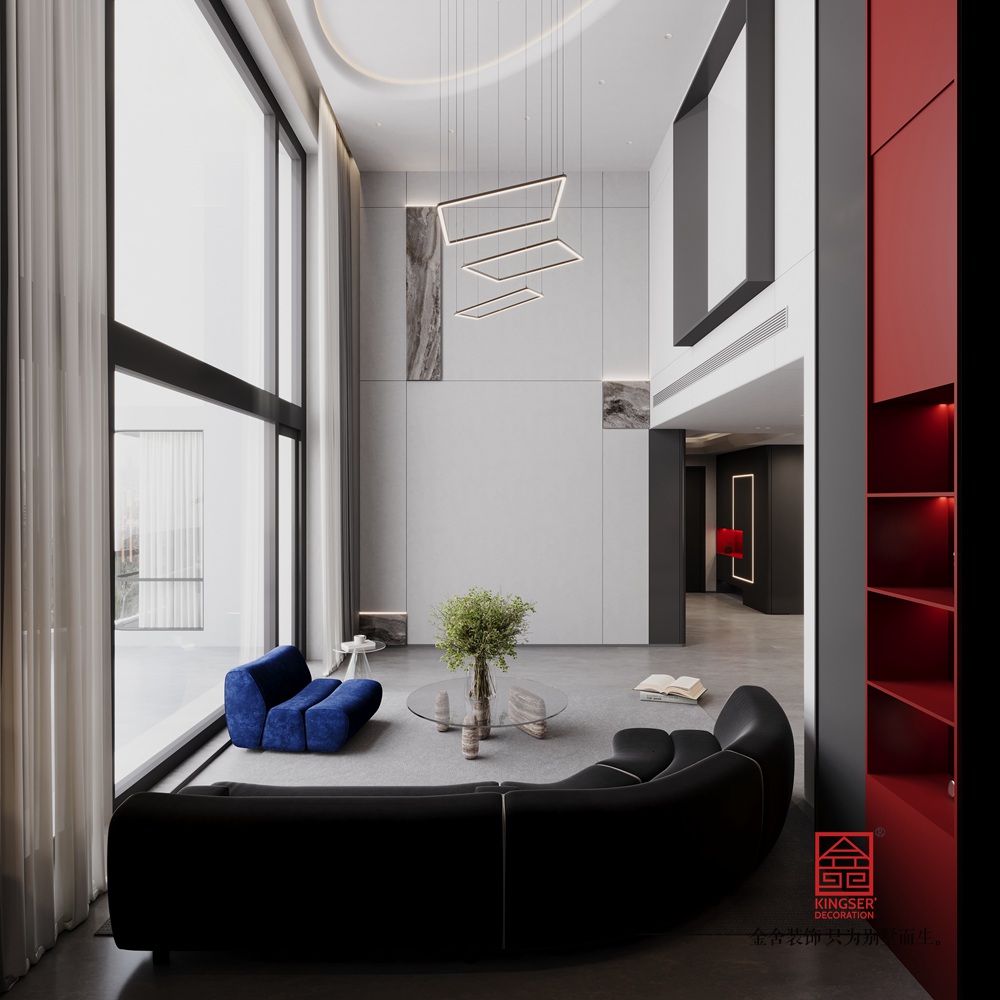 設(shè)計(jì)說明:用淺灰啞光墻面、深灰地面搭配通頂落地窗與柔紗簾,以極簡(jiǎn)線條與充足采光鋪就開闊冷靜的基底;墻面嵌入大理石紋理裝飾塊,結(jié)合頂部懸浮圓環(huán)燈與錯(cuò)落幾何吊燈,借材質(zhì)對(duì)比與燈光層次強(qiáng)化精致感;同時(shí)以 “黑 + 藍(lán) + 紅” 構(gòu)建色彩張力 —— 弧形黑色皮質(zhì)沙發(fā)柔化空間線條,寶藍(lán)色模塊座椅點(diǎn)亮視覺焦點(diǎn),右側(cè)高飽和紅色柜體以強(qiáng)對(duì)比打破單調(diào)并輔以內(nèi)嵌燈光烘托氛圍,再搭配透明玻璃茶幾等 “輕量感” 軟裝,最終在簡(jiǎn)約中透出高級(jí)質(zhì)感。