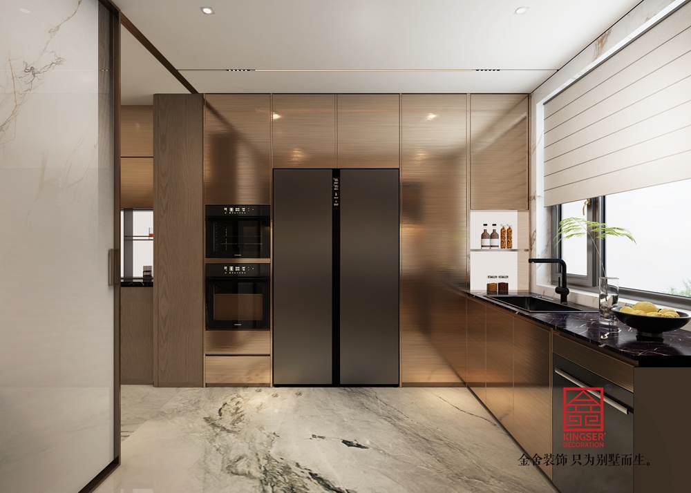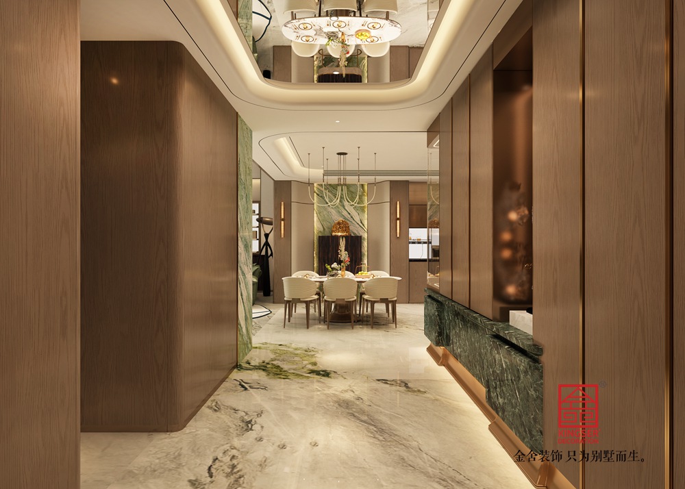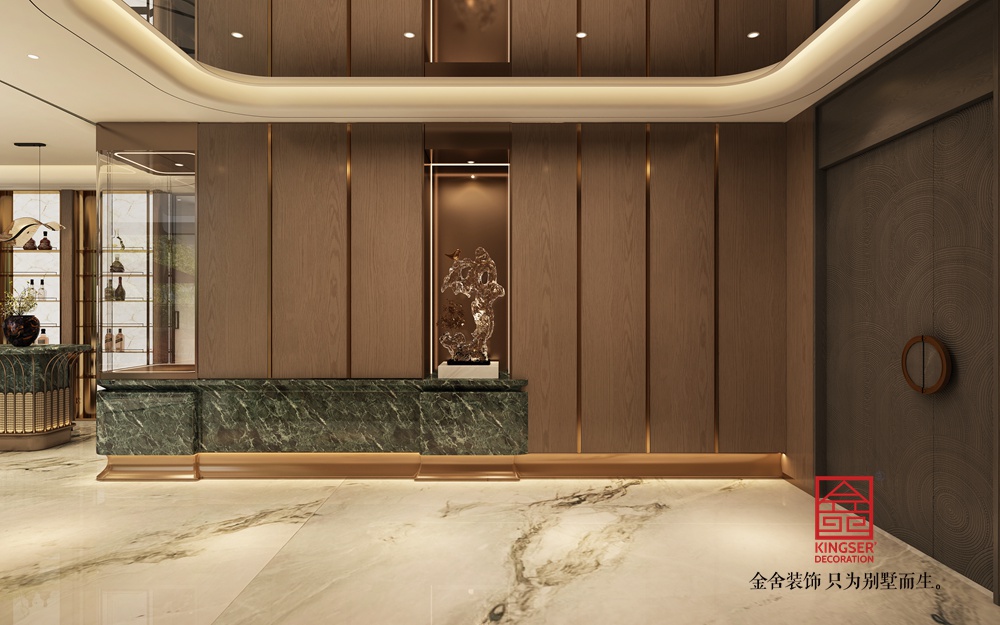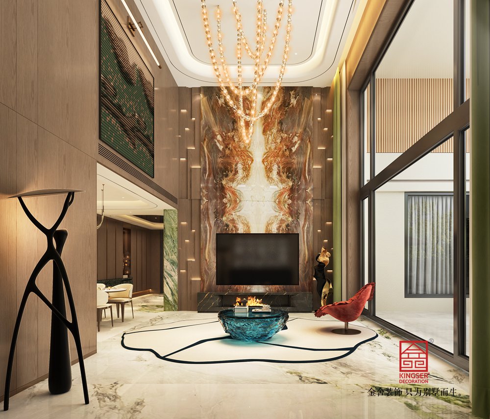 設計說明:這個空間以 “奢雅東方 × 現(xiàn)代奢華” 為設計內(nèi)核,以溫潤木飾面與大理石紋理鋪陳自然質(zhì)感基底,主墻面選用對稱式金色紋理大理石,借天然肌理的華麗張力營造視覺重心;頂部懸浮式吊頂搭配水晶枝形吊燈,輔以嵌入式燈光層疊出柔和光暈,強化空間的精致氛圍感;軟裝則以藍綠色藝術茶幾、紅色單人椅形成色彩點睛,搭配雕塑感落地燈與藝術擺件,在東方雅致與現(xiàn)代奢華的平衡中,構建出兼具格調(diào)與舒適的高階居住空間。