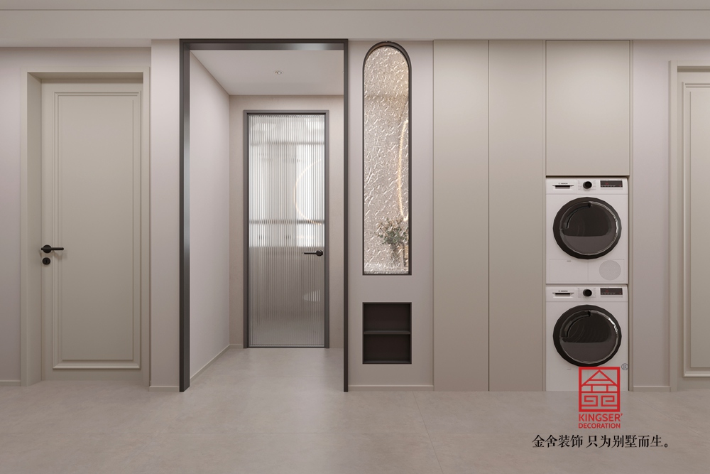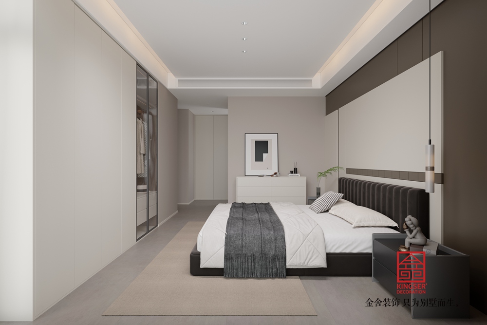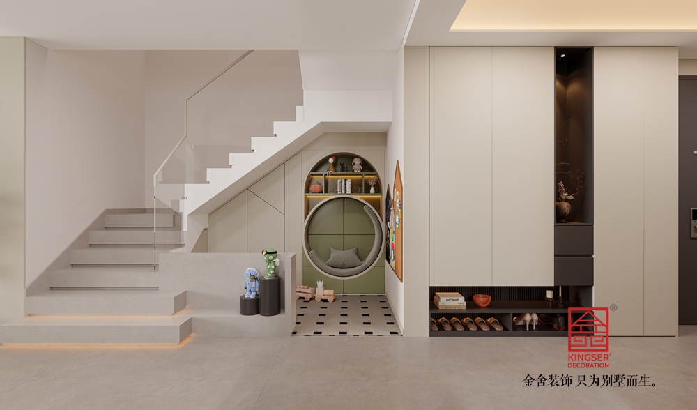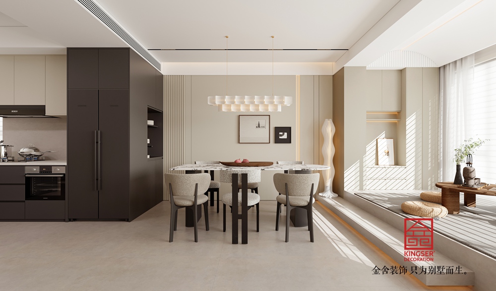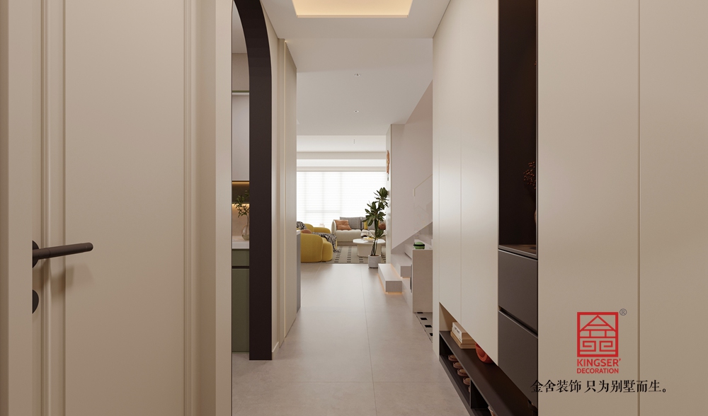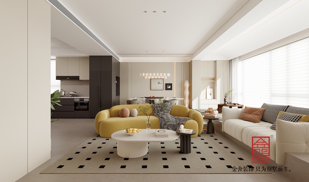 這個(gè)空間以 “現(xiàn)代簡(jiǎn)約 + 輕暖治愈” 為核心風(fēng)格,整體以米白、淺褐為柔和基底,通過明黃色弧形沙發(fā)作為視覺焦點(diǎn),搭配黑白棋盤格地毯與撞色抱枕,在低飽和基調(diào)中注入活潑張力,而廚房深灰柜體則形成沉穩(wěn)對(duì)比,平衡空間輕重;同時(shí)以通頂柜、隱形門強(qiáng)化整潔感,無主燈、線性燈帶與懸浮吊頂提升輕盈度,柔紗簾過濾出柔和光線,再配合客餐廚一體化的互動(dòng)布局,以及圓潤茶幾、藝術(shù)擺件等兼顧舒適與精致的軟裝選品,既適配日常休閑場(chǎng)景,也傳遞出松弛且高級(jí)的生活質(zhì)感。