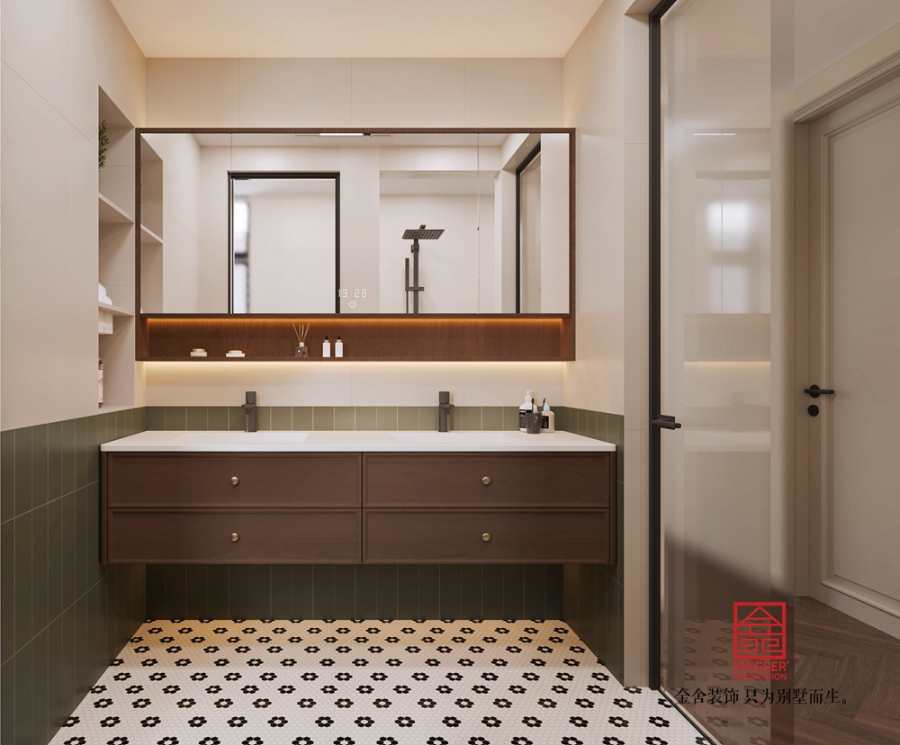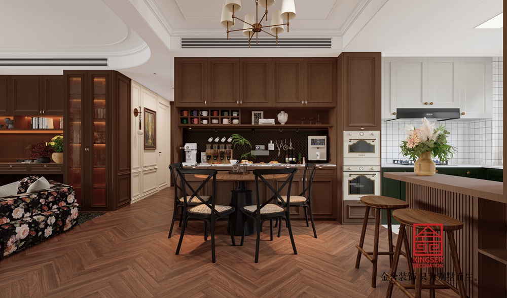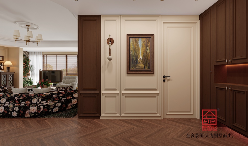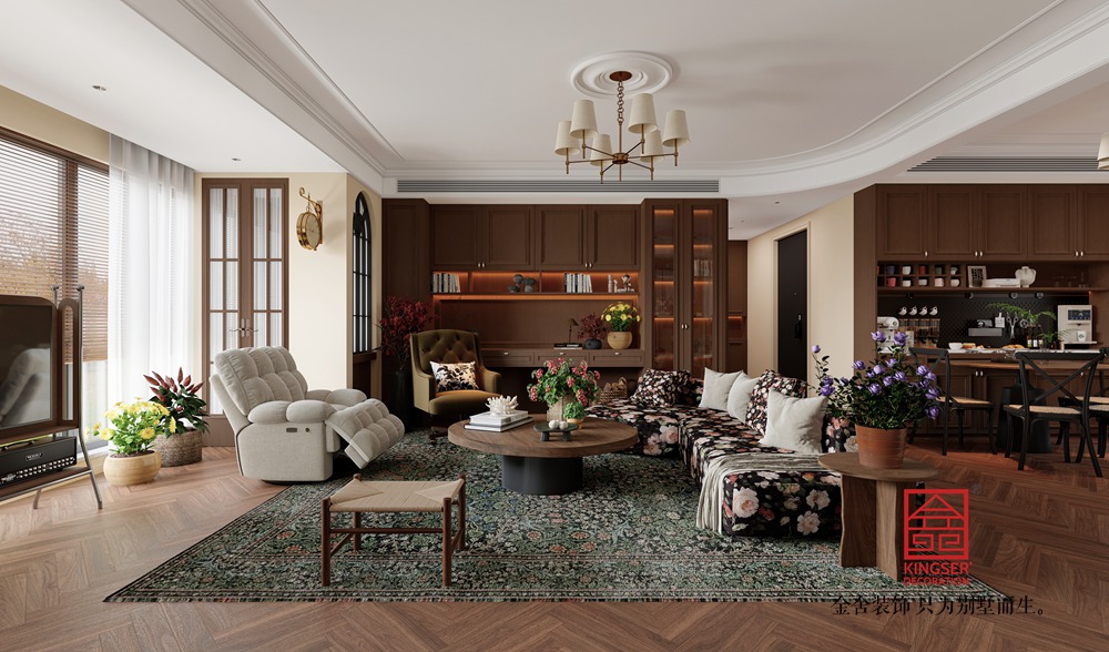 這個(gè)空間采用復(fù)古輕奢 + 暖調(diào)治愈的設(shè)計(jì)風(fēng)格,以深棕木作與暖米色墻面為基底,融入法式弧形吊頂、格紋門窗等細(xì)節(jié),既保留復(fù)古優(yōu)雅的質(zhì)感,又通過(guò)人字拼木地板增添溫暖肌理;軟裝搭配上,以繁花圖案沙發(fā)、復(fù)古綠單人椅呼應(yīng)濃郁的復(fù)古氛圍,搭配花紋地毯與鮮活花藝,柔化空間厚重感;功能區(qū)通過(guò)通頂收納柜實(shí)現(xiàn)整潔與展示兼具的效果,而黃銅吊燈、藝術(shù)擺件則提升精致度,整體既呈現(xiàn)出復(fù)古格調(diào)的松弛氛圍,又適配日常休閑與社交的多元需求。