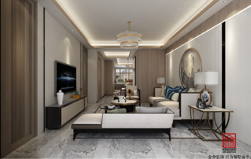 金舍裝飾~融創(chuàng)中心180平新中式風(fēng)格案例分享,中國傳統(tǒng)居室非常講究空間的層次感,這種傳統(tǒng)的審美觀念在“新中式”裝飾風(fēng)格中,又得到了全新的闡釋。依據(jù)住宅使用人數(shù)和私密程度的不同,需要做出分隔的功能性空間,則采用“埡口”或簡約化的“博古架” 來區(qū)分;在需要隔絕視線的地方,則使用中式的屏風(fēng)或窗欞,通過這種新的分隔方式,單元式住宅就展現(xiàn)出中式家居的層次之美。